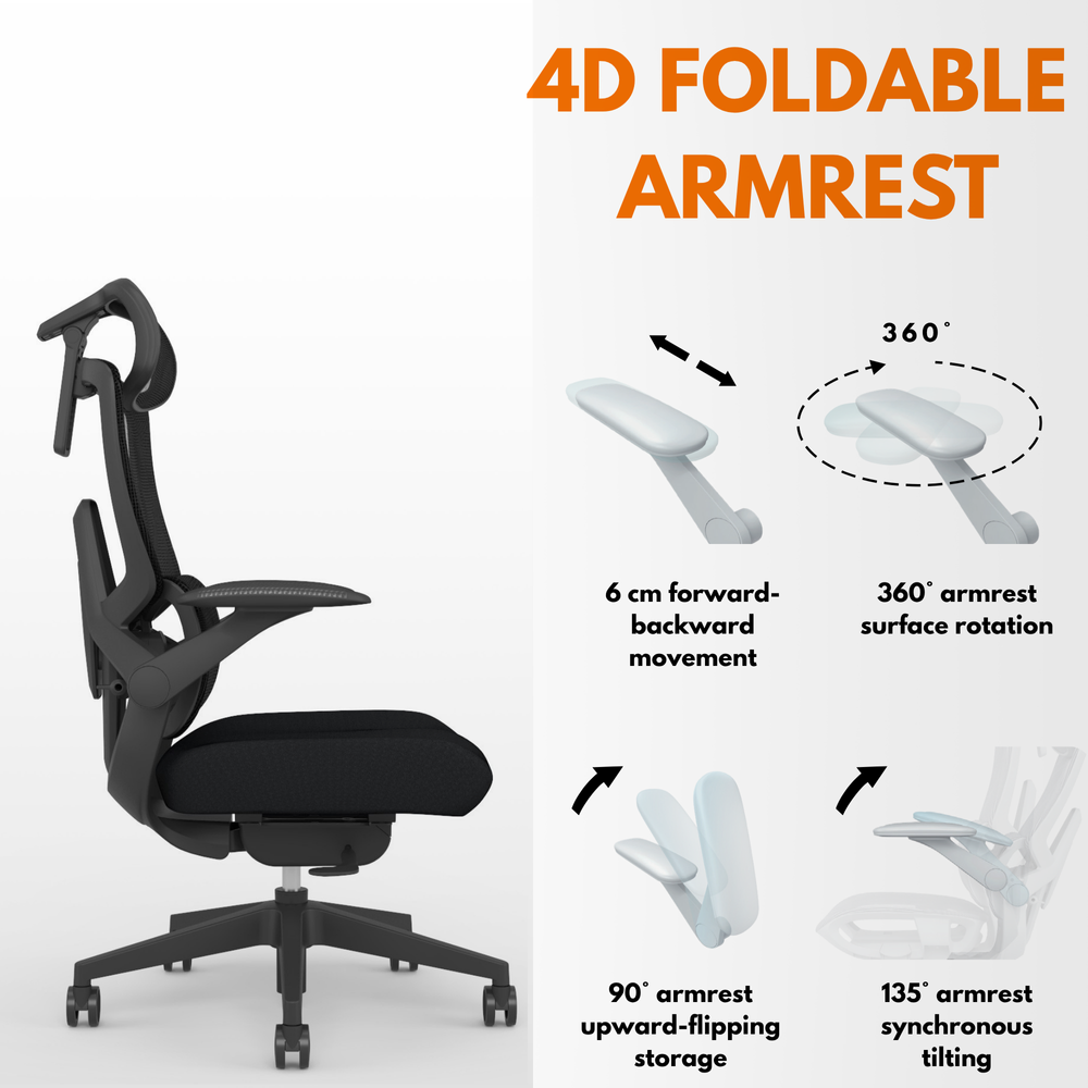 Foldable 4D armrests provide flexible support for arms, enhancing comfort and relaxation