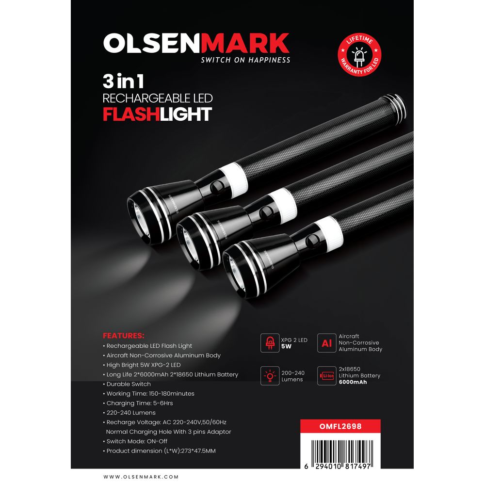 3-in-1 Rechargeable LED Flash Light, Cree LED - 5W, OMFL2698, Al Military Grade, High Lumens, Ni-Cd Battery 3.6V 3000mAh, Lifetime Warranty for LED