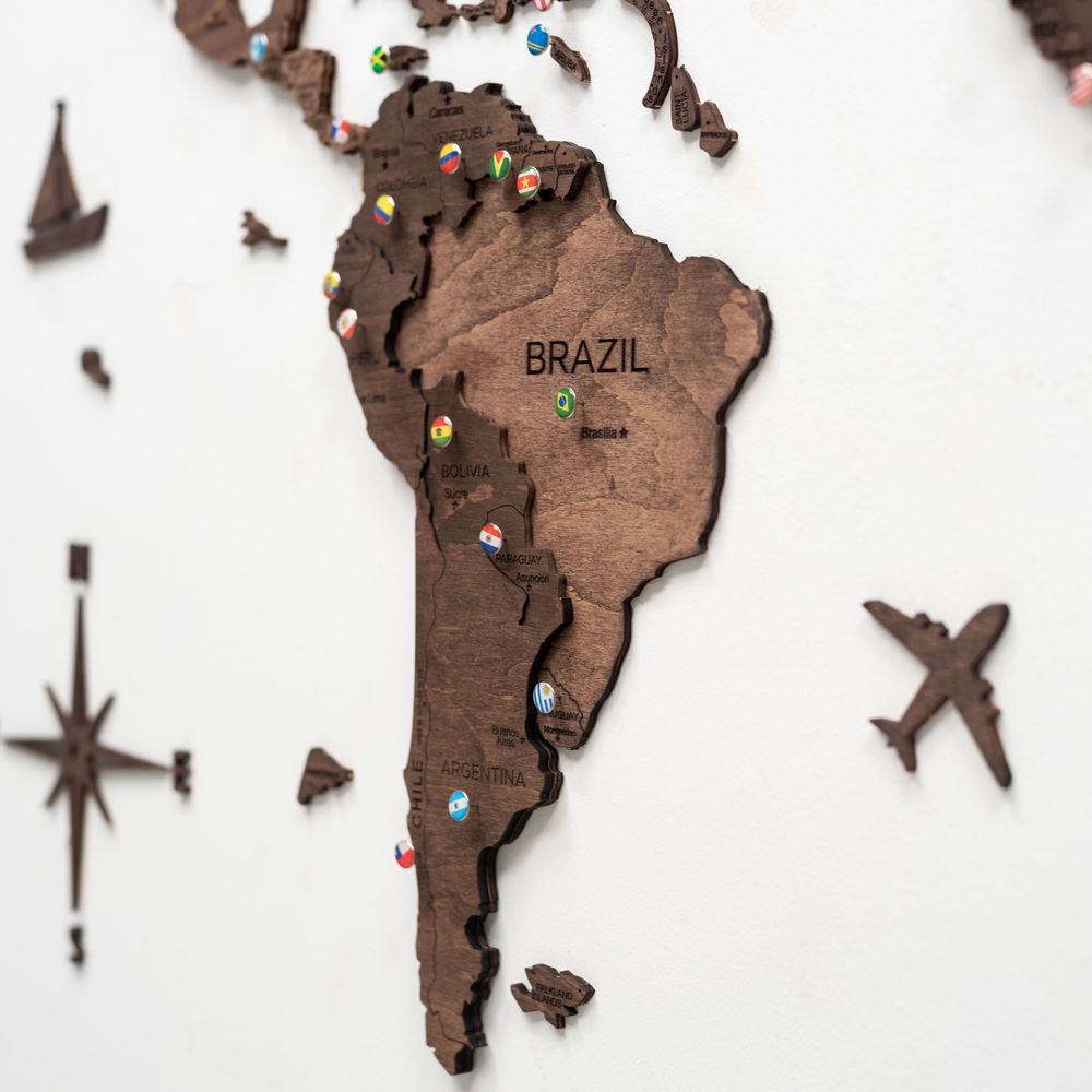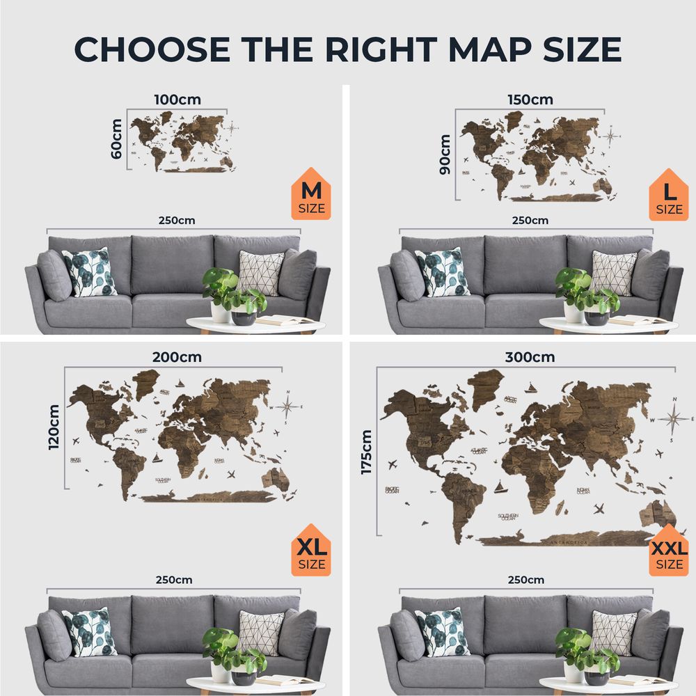 الخريطة العالمية الخشبية ثلاثية الأبعاد - بنية داكنة | طول النسخة الكبرى (200 × 120 سم)