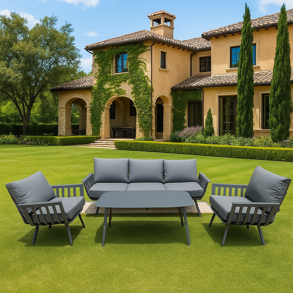 5-Seater Modern Curved Design Aluminium Outdoor Sofa Set – Dark Grey Frame with Soft Grey Cushions