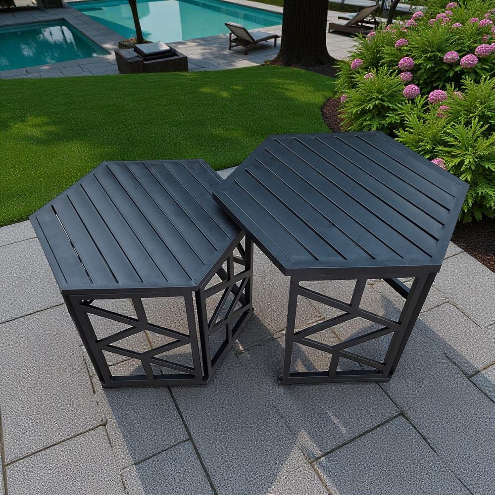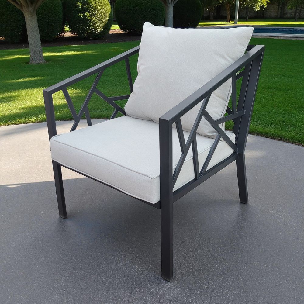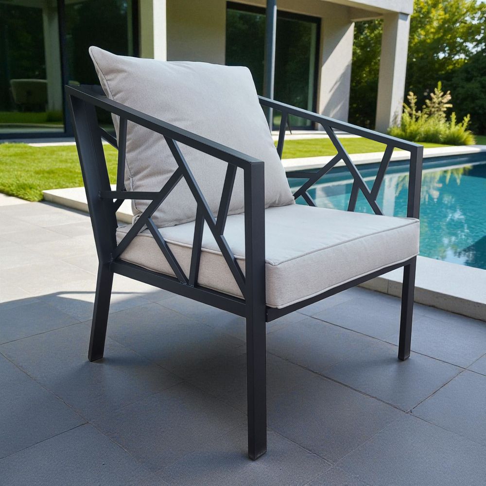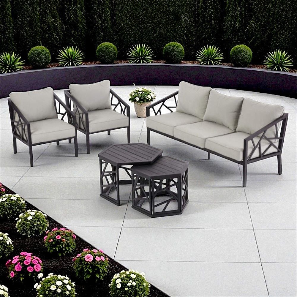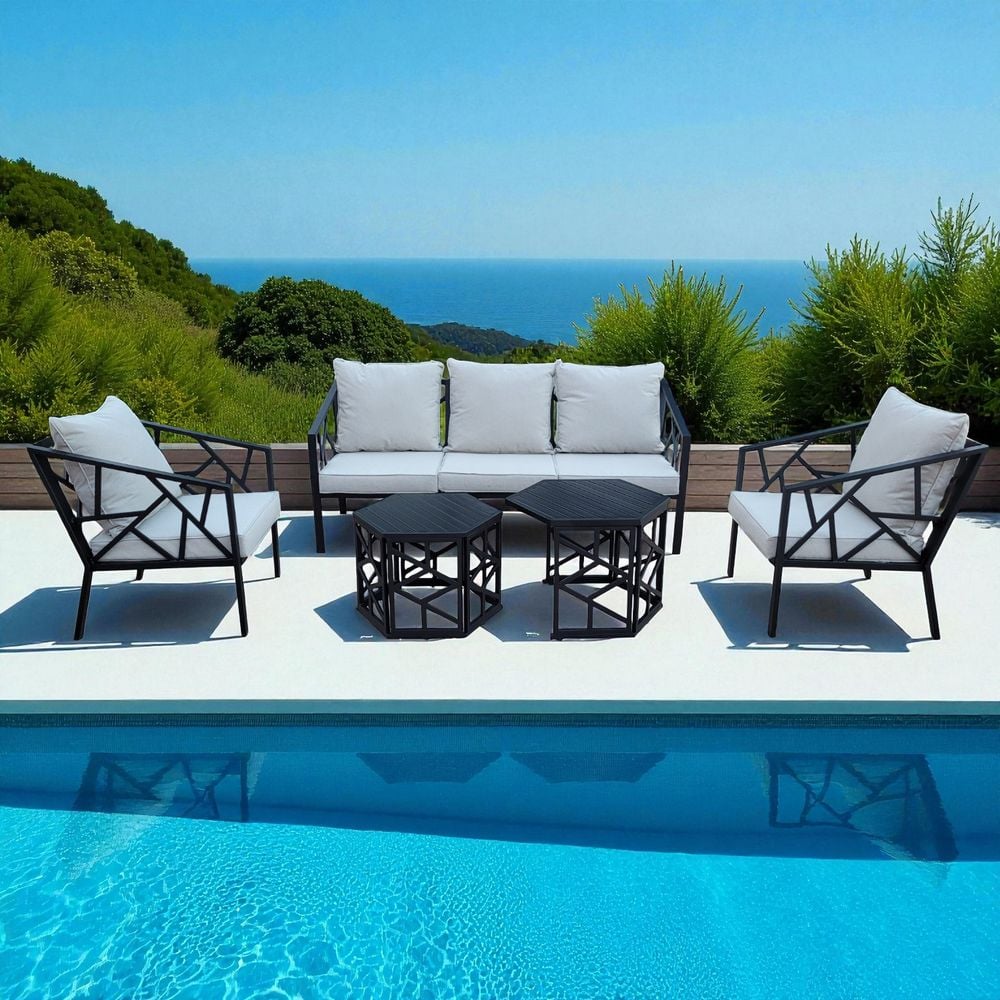 5-Seater Modern Outdoor Steel Sofa Set – Black Frame with Light Beige Cushions