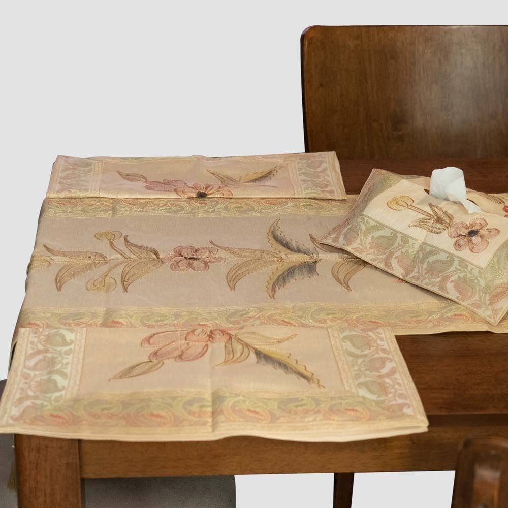 آسيا - طقم سفرة 4 قطع - 1 مفرش 50 ×150 سم - 2 لبادة صحون 50 × 50 سم - 1 غطاء علبة مناديل - بيج فاتح