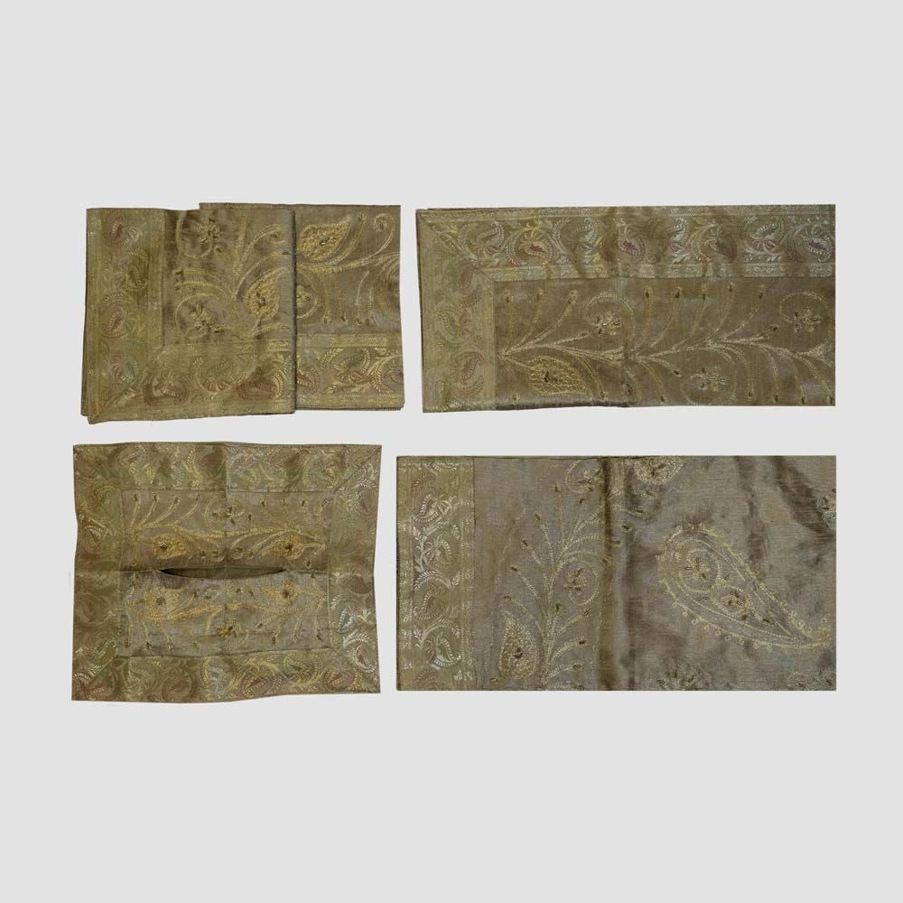 آسيا - طقم سفرة 5 قطع - 1 مفرش سفرة 110 × 110 سم - 1 مفرش 50 ×150 سم - 2 لبادة صحون 50 × 50 سم - 1 غطاء علبة مناديل - نحاسي