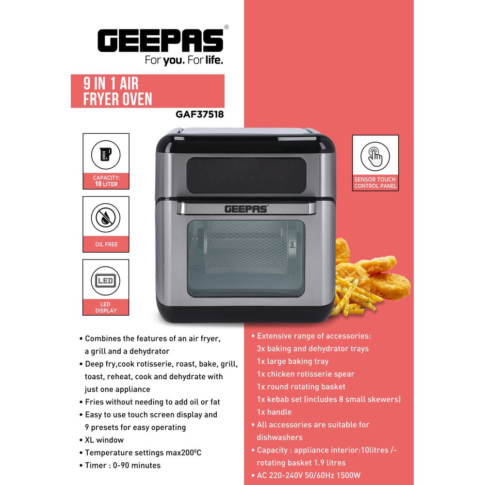 Geepas Air Fryer Oven Digital 9-In-1 Convection Air Fryer 10 L| Toaster Oven Combo Rotisserie & Dehydrator| Oil-Free Countertop Oven With Led Digital Touchscreen| 90 Min Timer 10 L 1500 W GAF37518 Silver/Black