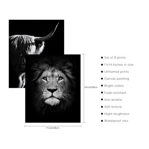ALAYRA Black and White Animals Wall Art Prints Set of 6 Animal Pictures Cow Print Decor Elephant Wall Decor Canvas Animal Wall Art Posters Set for Home Decor (11"x14" UNFRAMED)