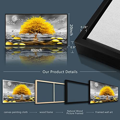 ALAYRA Black Wood Framed Canvas Wall Art For Living Room Large Wall Decor For Bedroom Office Wall Decorations Black And White Scenery Pictures Yellow Tree Wall Paintings Canvas Prints Home Decor 20" X 40"