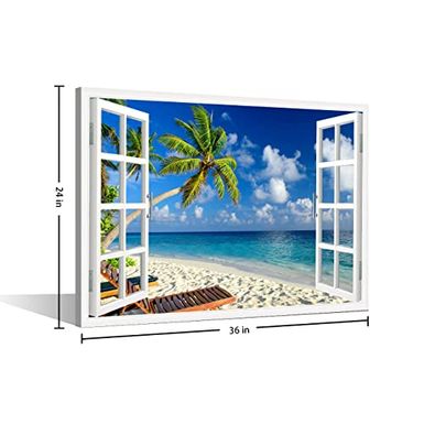صور المنتج ALAYRA Canvas Wall Art 3D Window View Summertime Art Beach Seaside Coconut Tree Picture for Home Office Bathroom Bedroom Stretched Giclee Framed Print Ready to Hang 36x24inch تستخدم لأغراض التوضيح فقط. وقد يختلف لون المنتج قليلاً بسبب إضاءة التصوير أو إعدادات الشاشة.