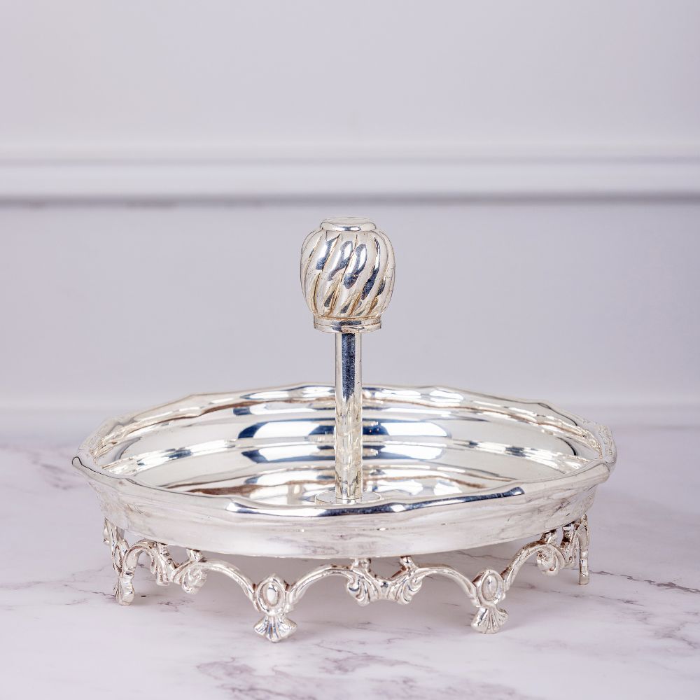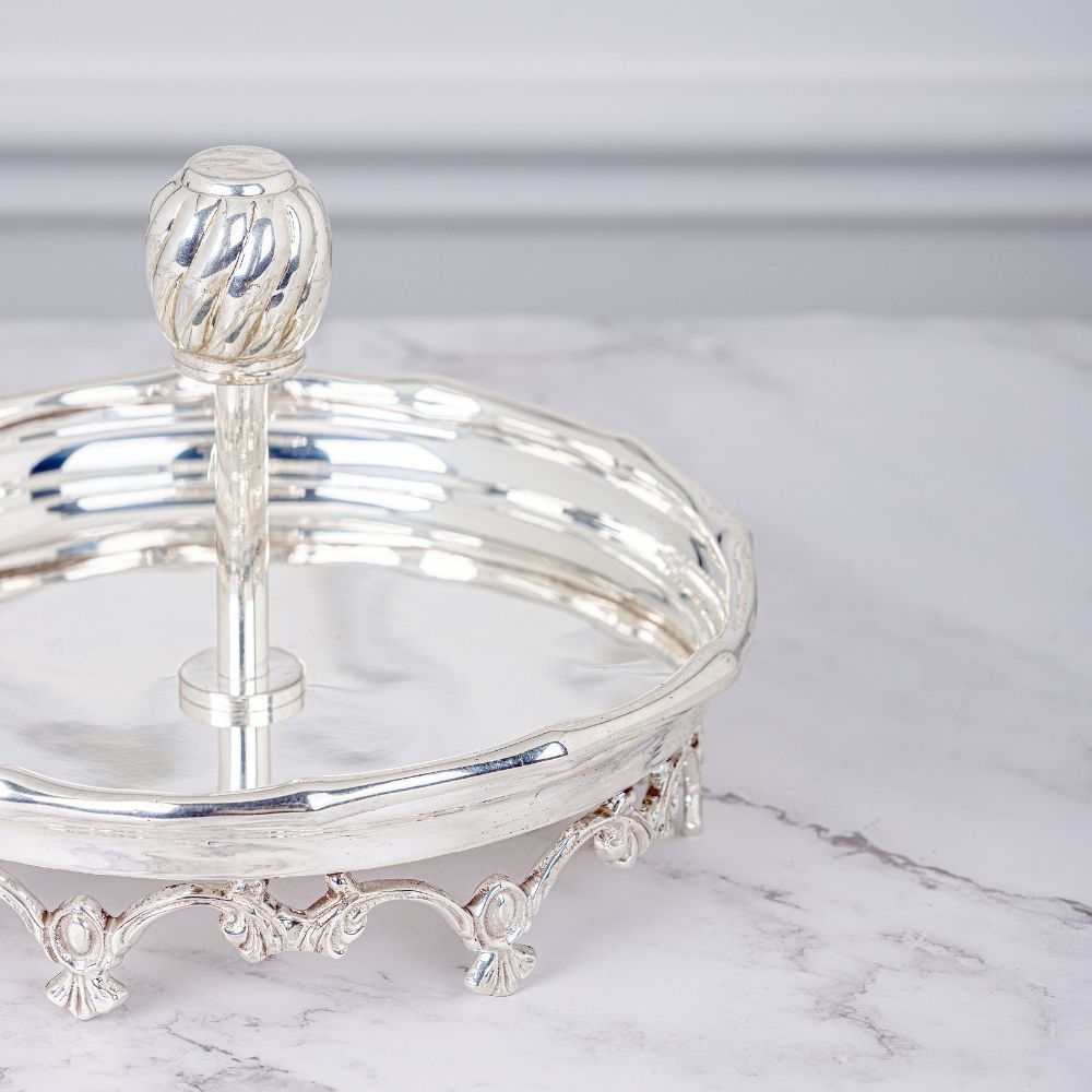 Elevate your dining and serving experience with our Round Silver-Plated Brass Serving Platter/Cake Stand, designed for those who appreciate timeless elegance