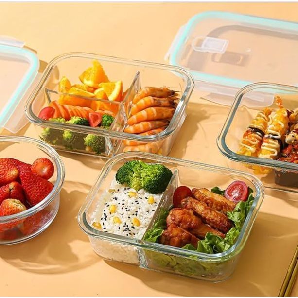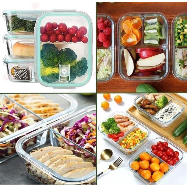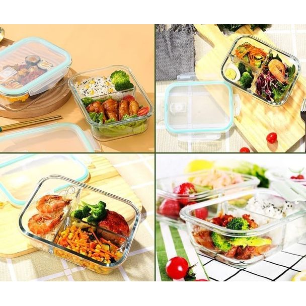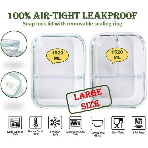 AtrauX (4-Pcs) 2 & 3 Compartment Glass Meal Prep Containers Lunch Box, Portion Control, -1520ml (Large Size)