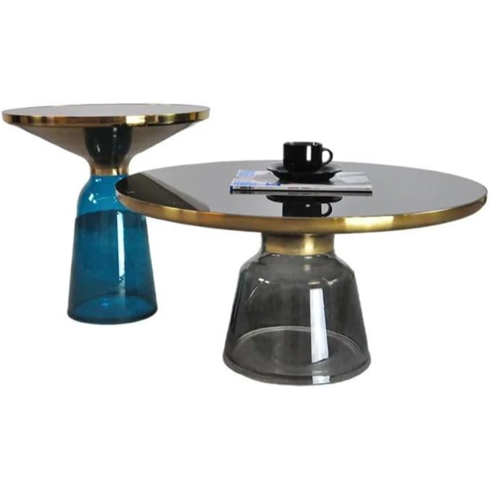 Each table has a unique glass base: the larger one with a gray-tinted glass base, while the smaller one has a blue-tinted glass base. The combination of black, gold, and tinted glass creates a contemporary and chic look that works beautifully in both office and living room settings.