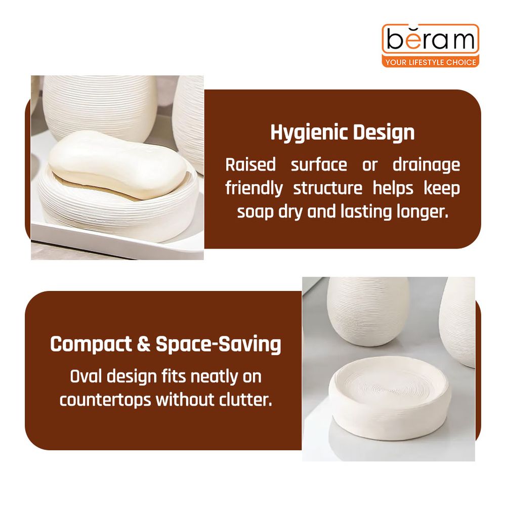 Beram Bathroom Accessory White Stripes Set 5 Piece Ceramic Natural Textured Design with Soap Dispenser Toothbrush Holder Tumbler Multifunction Holder & Soap Dish (Soap Holder)