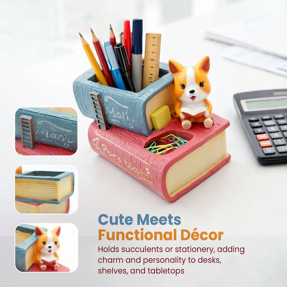 Its compact design makes it ideal for succulents, mini plants, or artificial flowers, while its versatility allows it to double as a pen/pencil holder for your desk. The intricate details — from the playful corgi to the textured book bindings — make it a standout accent for any home, office, or study area.