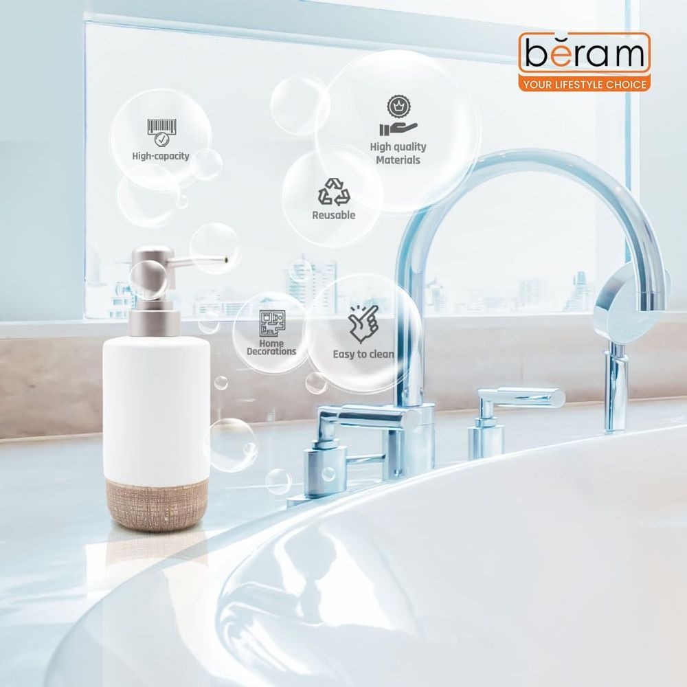 Compact yet functional, it provides ample capacity without taking up excess space on your countertop. Whether used individually or paired with the Beram 4-Piece Ceramic Bathroom Accessory Set, this liquid dispenser delivers a refined balance of practicality, durability, and style to elevate your daily routine.