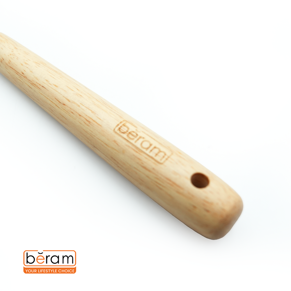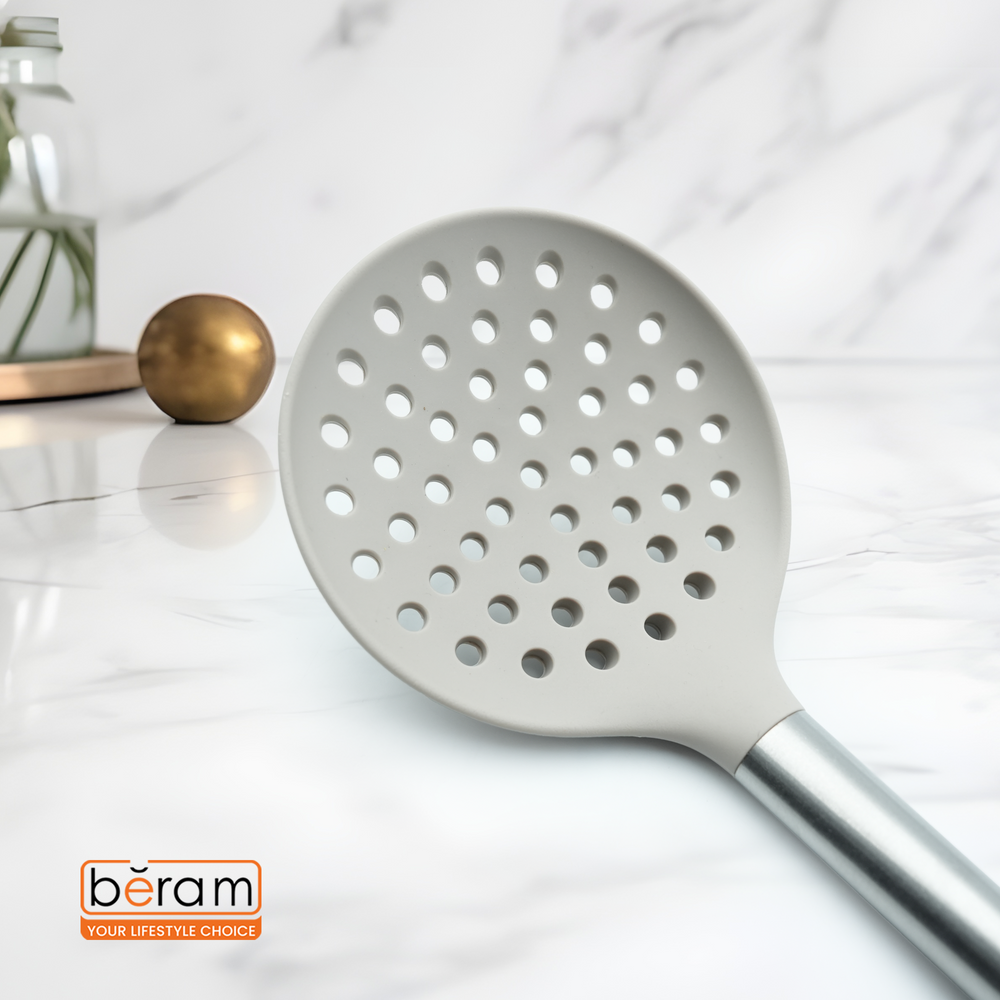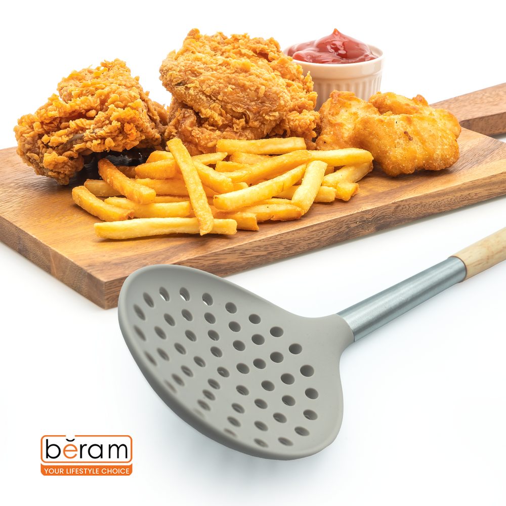 The Beram silicone skimmer is a must-have for frying, boiling, and blanching tasks in the kitchen. Its wide, perforated silicone head efficiently drains oil, water, or broth while lifting food safely and neatly. Built with a stainless steel core and a sturdy wooden handle, this tool offers excellent control and heat resistance. The non-stick safe silicone material is BPA-free, ensuring both performance and peace of mind in daily cooking.