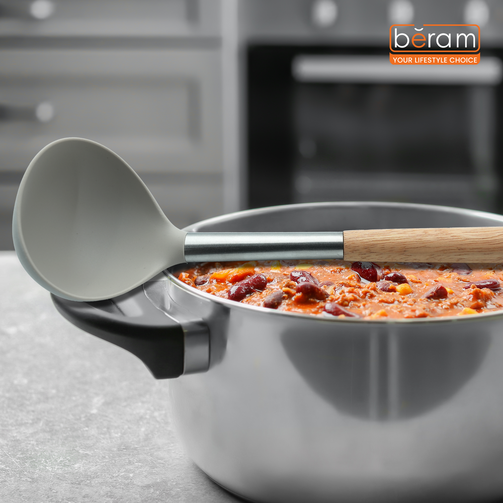 Serve soups, stews, and sauces with ease using the Beram Silicone Soup Ladle. Crafted from high-quality, BPA-free silicone, this ladle features a deep, flexible bowl for efficient scooping and drip-free serving. Reinforced with a stainless steel core and finished with a smooth wooden handle, it offers both strength and style. The heat-resistant silicone is gentle on non-stick cookware, while the ergonomic handle ensures comfort and control. Ideal for everyday cooking or elegant table serving.