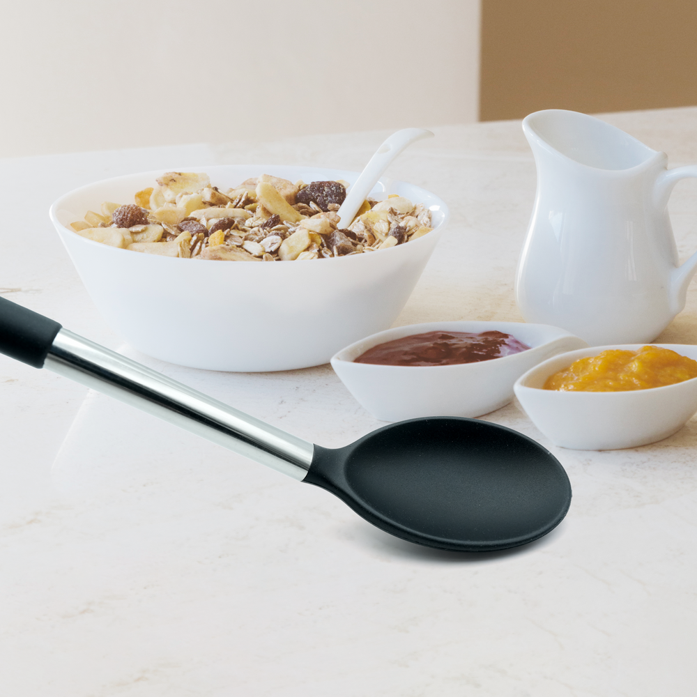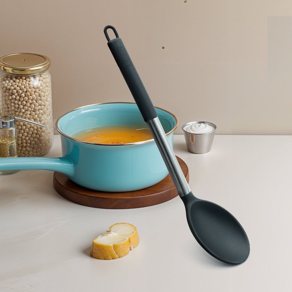 Ideal for stirring soups, folding batter, sautéing vegetables, or plating meals, the Beram Cooking Spoon is a reliable, professional-grade utensil made for both home cooks and culinary enthusiasts. Its elegant black and silver finish fits seamlessly into modern kitchen aesthetics while delivering everyday practicality.