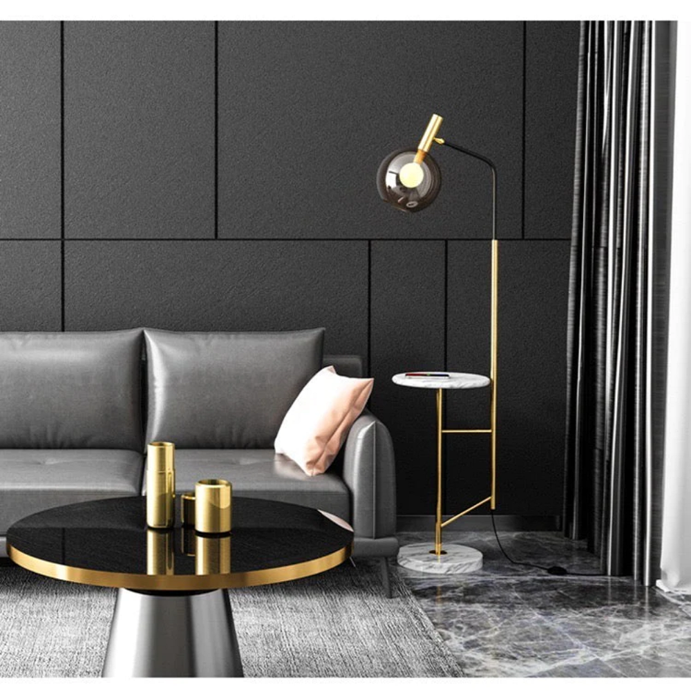 Corner black and gold floor lamp with marble tray and marble base giving elegant design for your living room