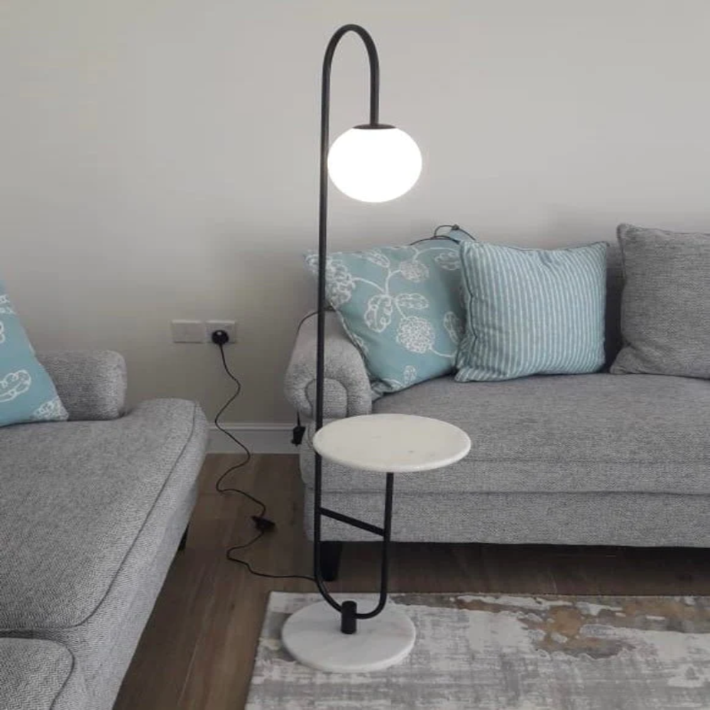 Black metal floor lamp with marble plate and marble base