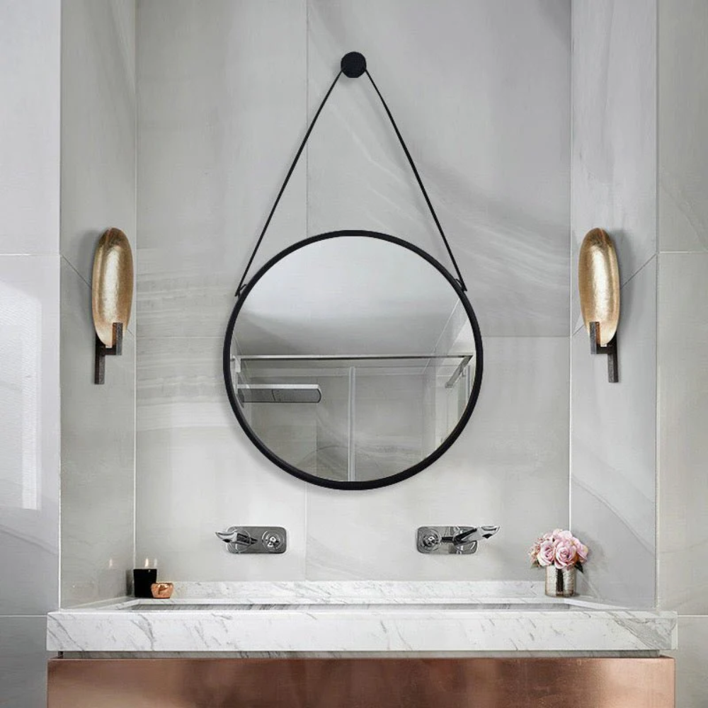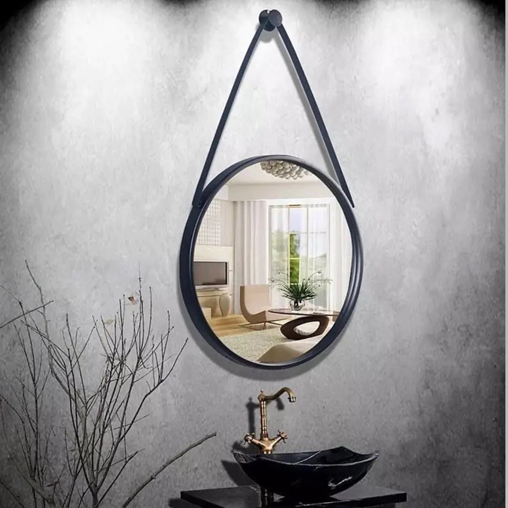 Aluminum round mirror with metal hanger very unique design added style to your bathroom or bedroom