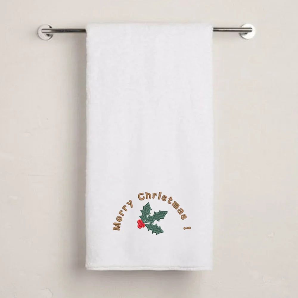 Bring festive elegance to your home with the BYFT Embroidered For You Personalised Christmas Towel - Merry Christmas Holly Wreath Arc Design. Featuring a beautifully curved holly wreath paired with a festive “Merry Christmas” message, this towel adds a warm and classic holiday touch to any space.