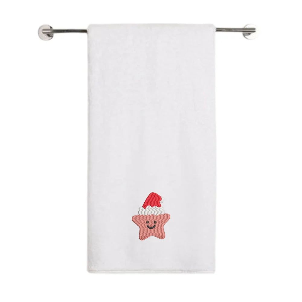 Iris Christmas Embroidered 70 x 140 Cm White Bath Towel - "Smiling Christmas Star with Santa Hat" Design 100% Cotton - Premium Holiday Collection