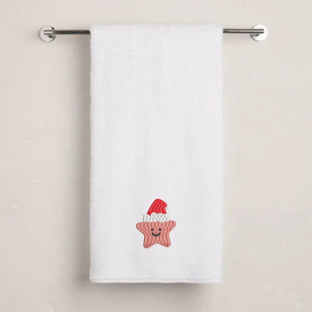 Add joyful festive charm to your home with the BYFT Embroidered For You Personalised Christmas Towel - Smiling Christmas Star with Santa Hat Design. Featuring a cute embroidered star wearing a Santa hat, this towel brings cheerful holiday vibes and makes a delightful seasonal gift.