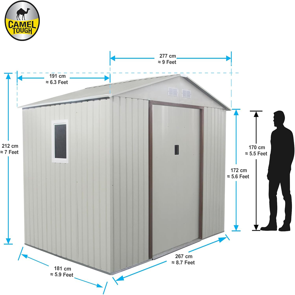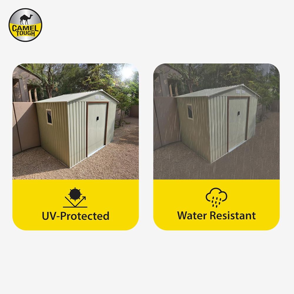 Upgrade your outdoor space, patio, or garage with the CamelTough Outdoor Metal Storage Shed Combo, a complete solution designed for durability, organization, and long-term use. Measuring 9.1 x 6.3 feet and standing 212 cm tall, this premium garden shed offers more vertical capacity than most standard metal sheds, making it perfect for storing large tools, patio furniture, or bulky equipment. The wide sliding door ensures smooth access to your items, while the integrated ventilation slot keeps the interior cool, dry, and aerated.