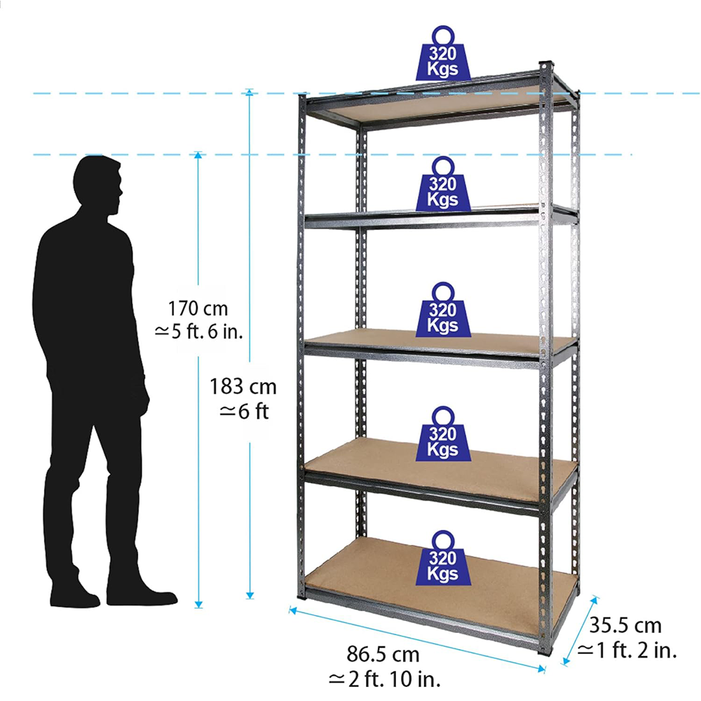HEAVY DUTY SHELF RACK: Multi-purpose shelf rack can be used as a storage rack or workbench, ideal for garage or warehouse heavy loads; holds up to 320kg per shelf, size 86.5W x 35.5D x 183H cm.