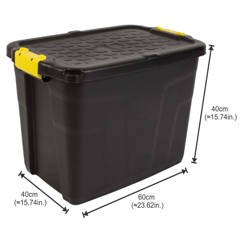 STORAGE BOX: The heavy-duty plastic storage box (60 Liter) with secure lid is durable and perfect for bulk storage of household, garden, or garage items.