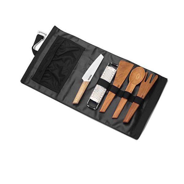 Includes a knife + grater and wooden cooking spoons and utensils conveniently rolled in a durable wrap