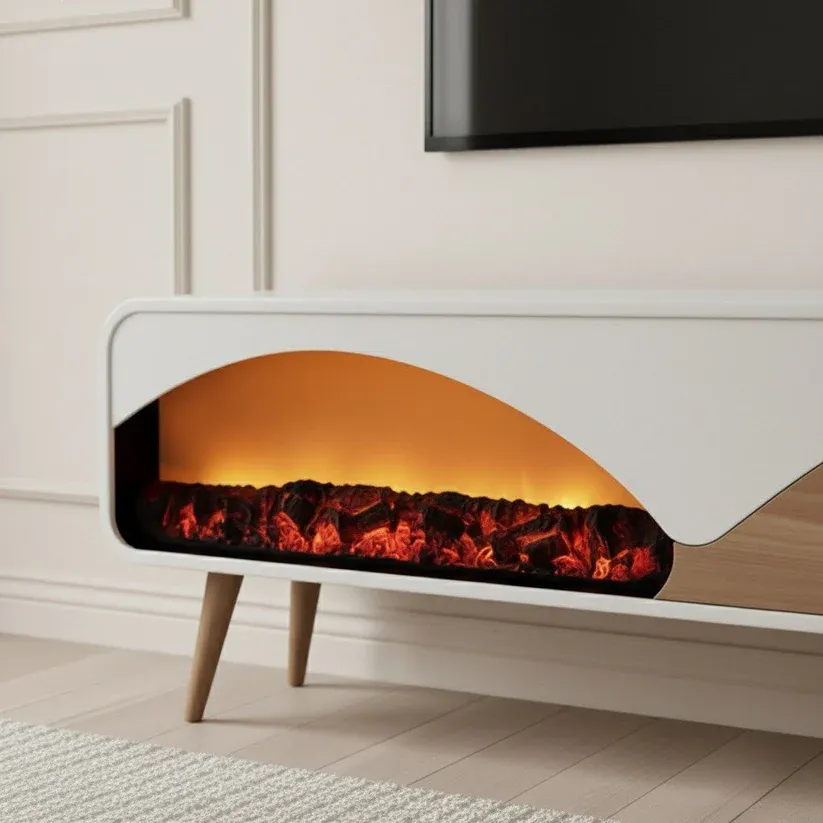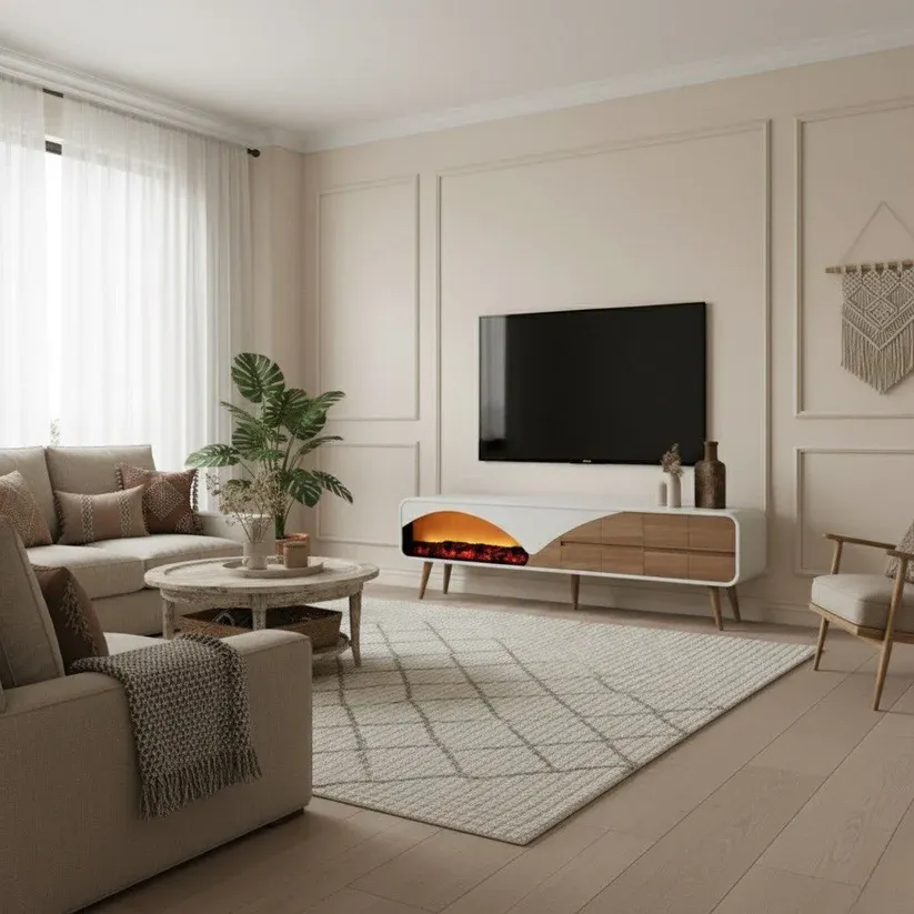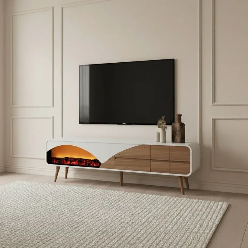 Equipped with two push-to-open drawers, this unit offers discreet storage for remotes, consoles, and accessories. The integrated LED fireplace display creates a warm, inviting atmosphere, enhancing both style and comfort without the maintenance of a traditional fireplace.