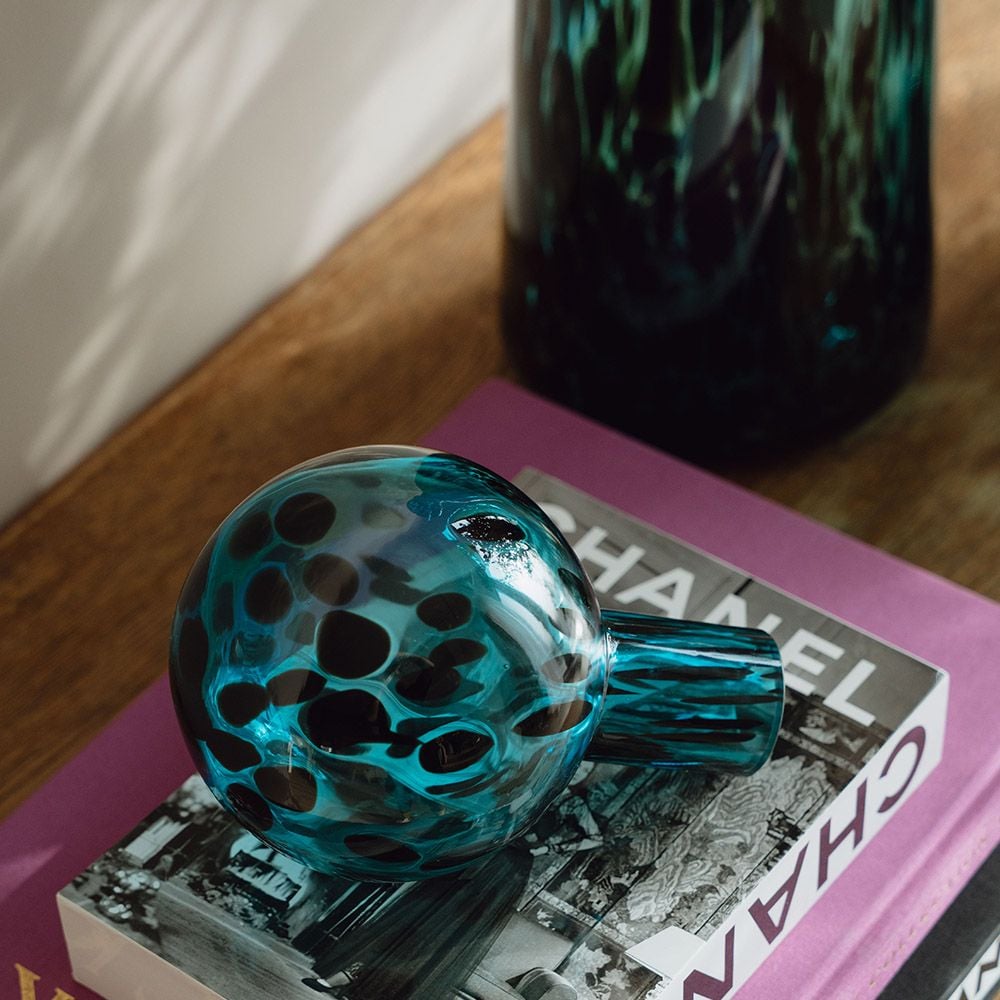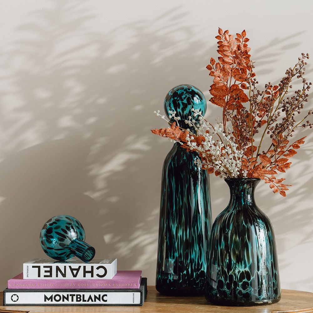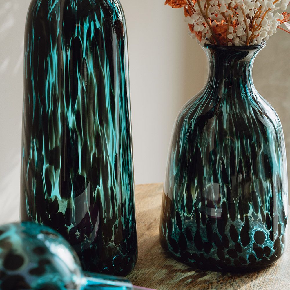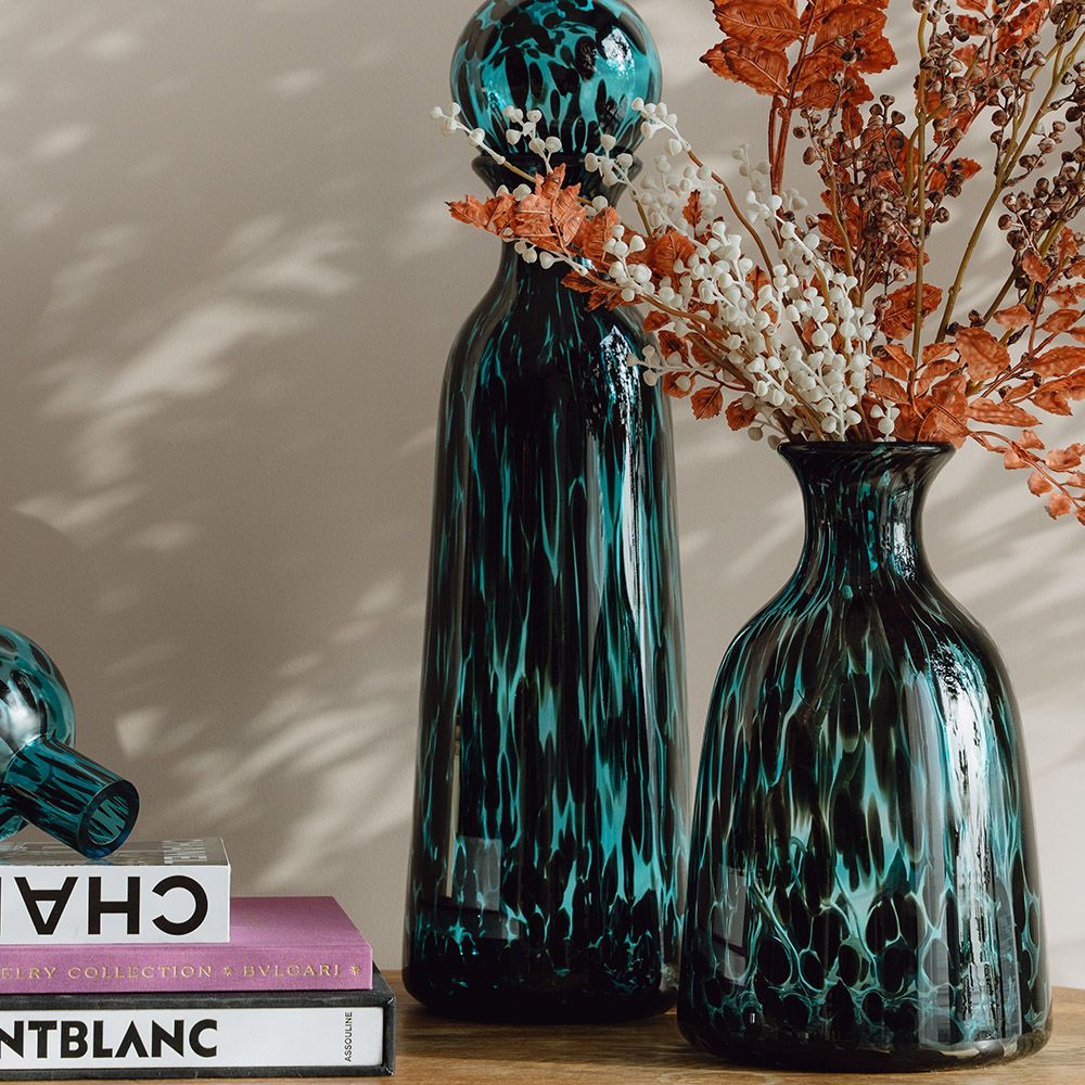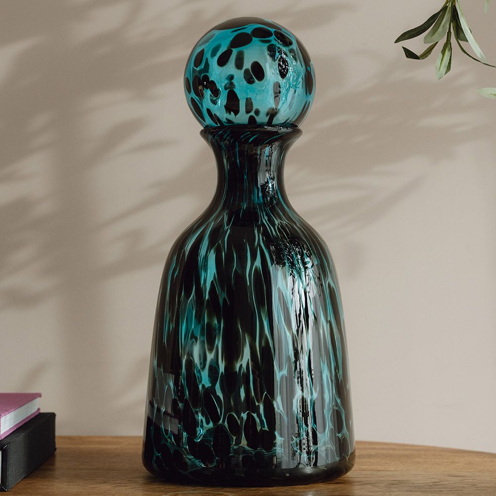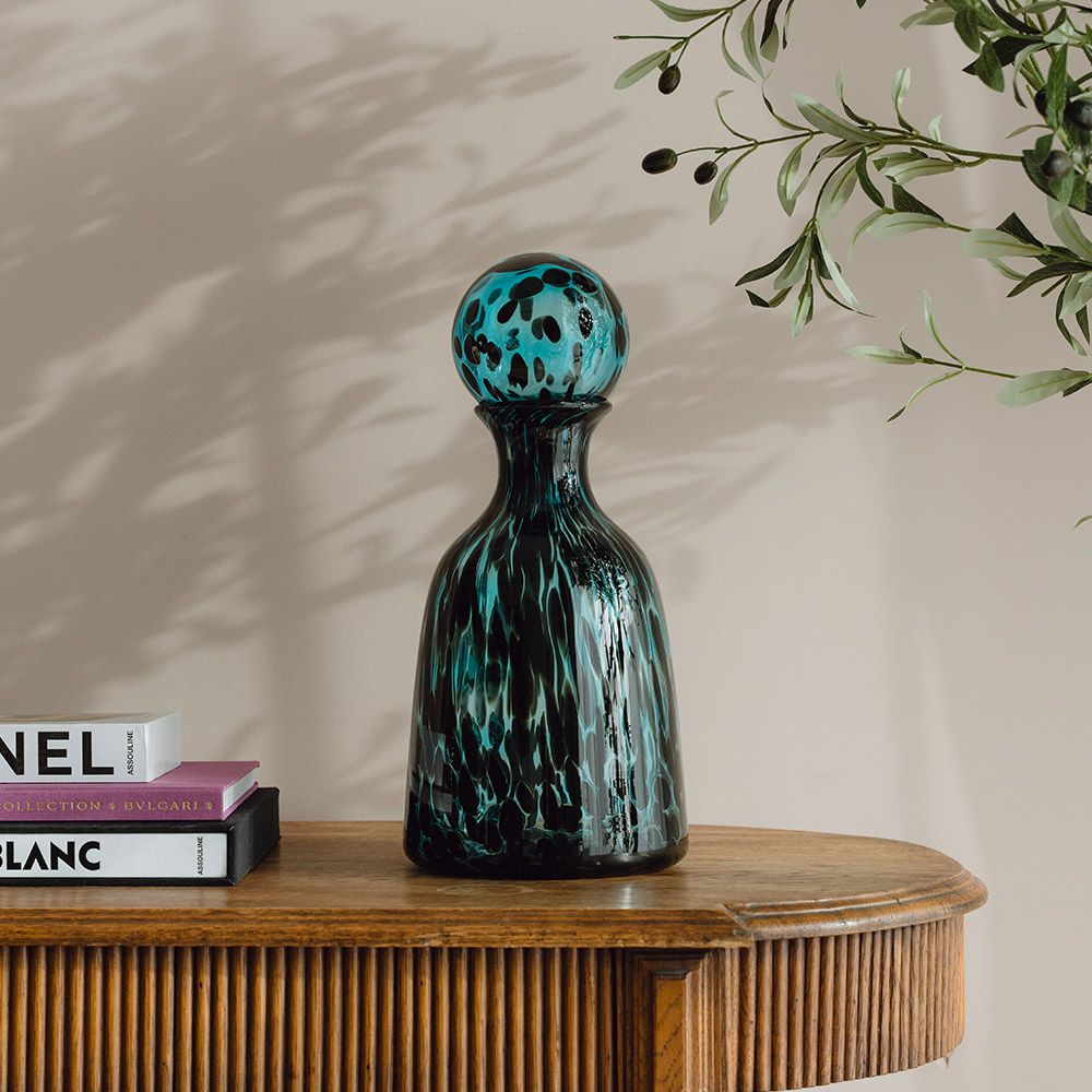 The Capri Glass Bottle Jar is a striking blend of art and elegance, featuring a deep fusion of teal and black in a mesmerizing mottled pattern