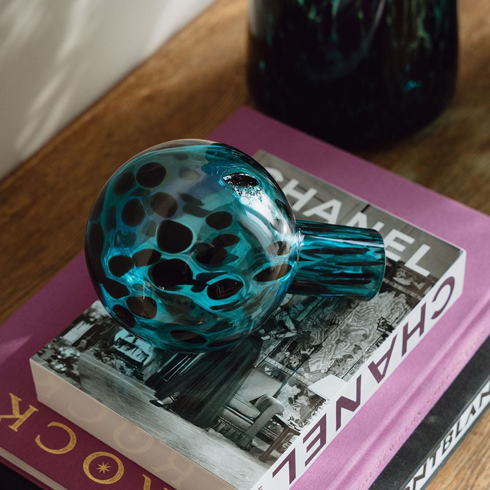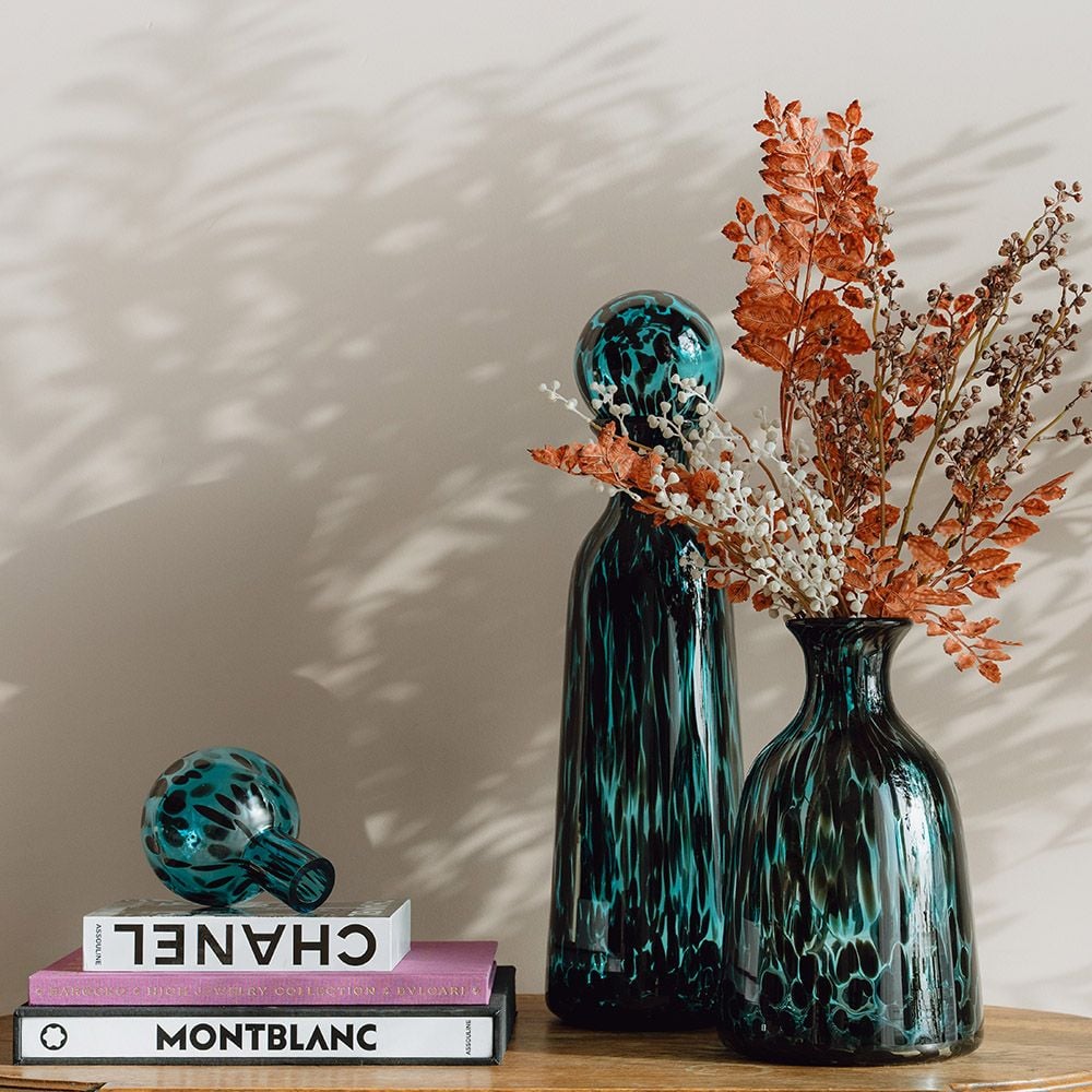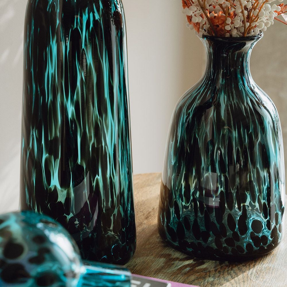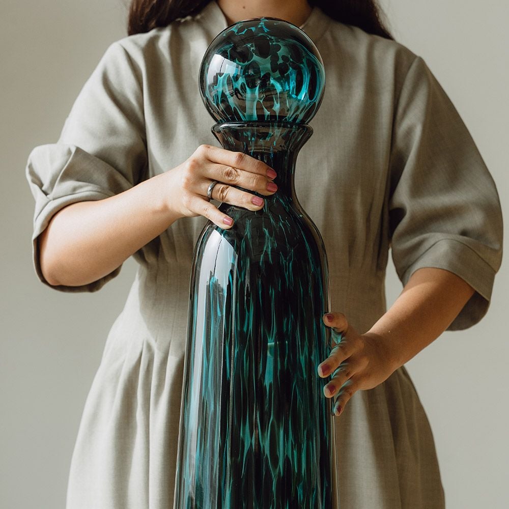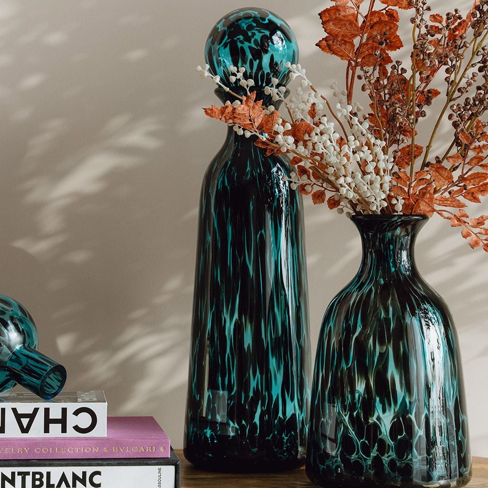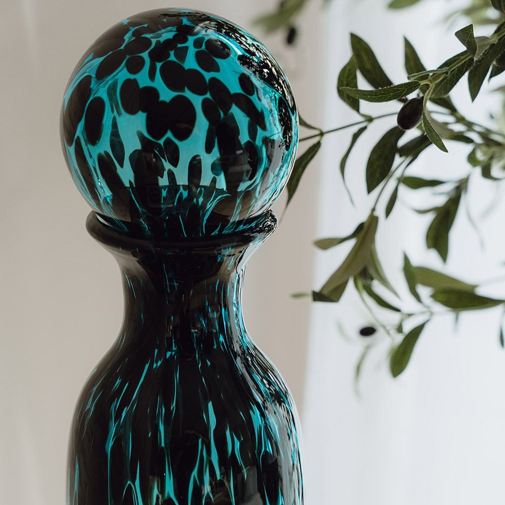 The Capri Glass Bottle Jar is a striking blend of art and elegance, featuring a deep fusion of teal and black in a mesmerizing mottled pattern