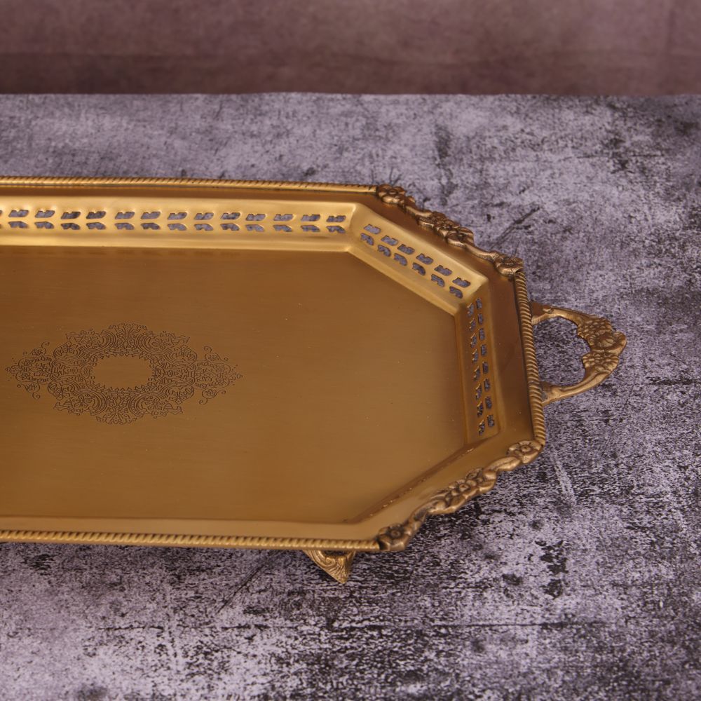 This elegant tray features finely detailed edges and a rich antique brass finish, combining timeless charm with versatile functionality