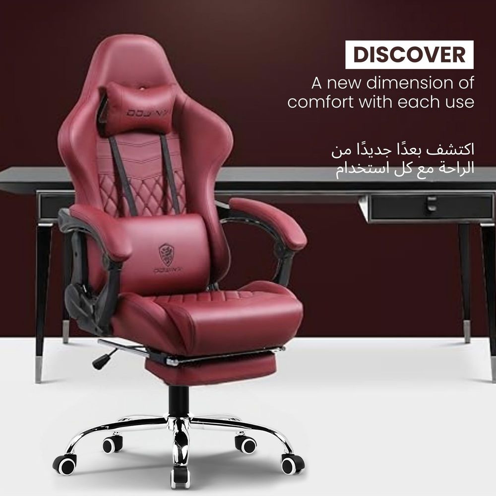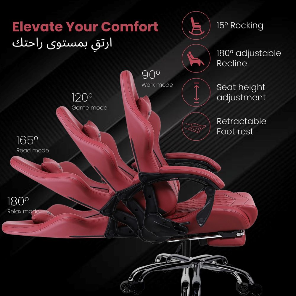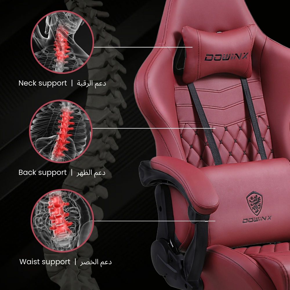 Trusted globally and now in the GCC, Dowinx delivers top-tier comfort with this premium ergonomic gaming chair. Designed for gamers, streamers, and professionals, it features a USB-powered massaging lumbar pillow, adjustable headrest, and ultra-thick seat cushion to ease pressure during long hours of sitting. Enjoy full-body relaxation with a deep 180° reclining backrest, retractable footrest, and smart linkage armrests that adjust as you lean back – perfect for work, play, or even a quick nap. Built with high-density foam, pocket springs, a widened metal frame, and a durable PU leather finish that’s stylish and easy to clean. Equipped with 360° swivel, height adjustability, and a smooth tilt mechanism, it adapts to every posture. Assembles easily in under 20 minutes with included tools.