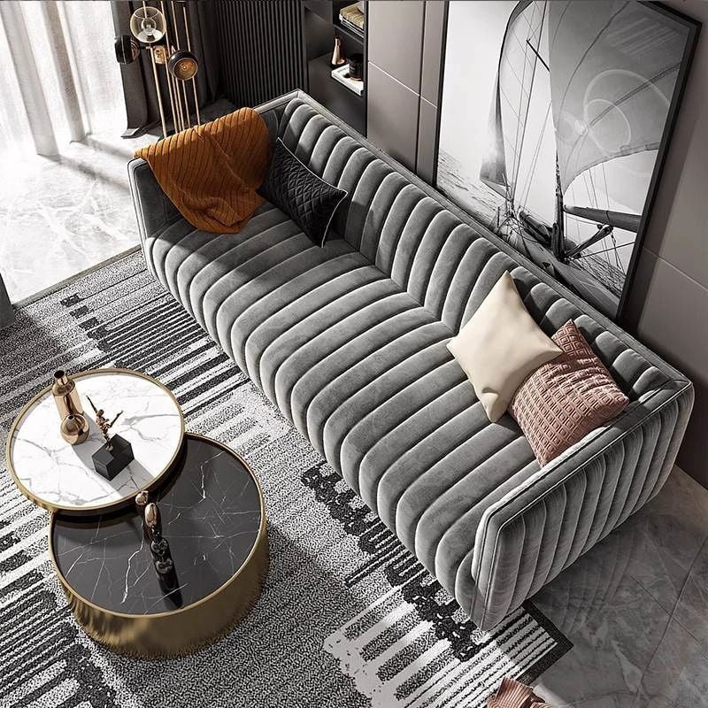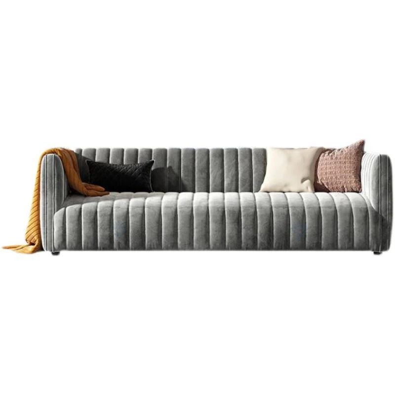 Elevate your living space with this elegant gray sofa, featuring a modern minimalist design enhanced by sophisticated channel tufting that offers a sleek, ribbed texture. Crafted from durable solid wood. Its refined construction and luxurious style deliver both comfort and timeless contemporary appeal.
