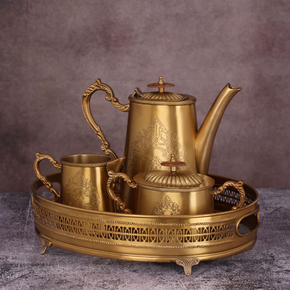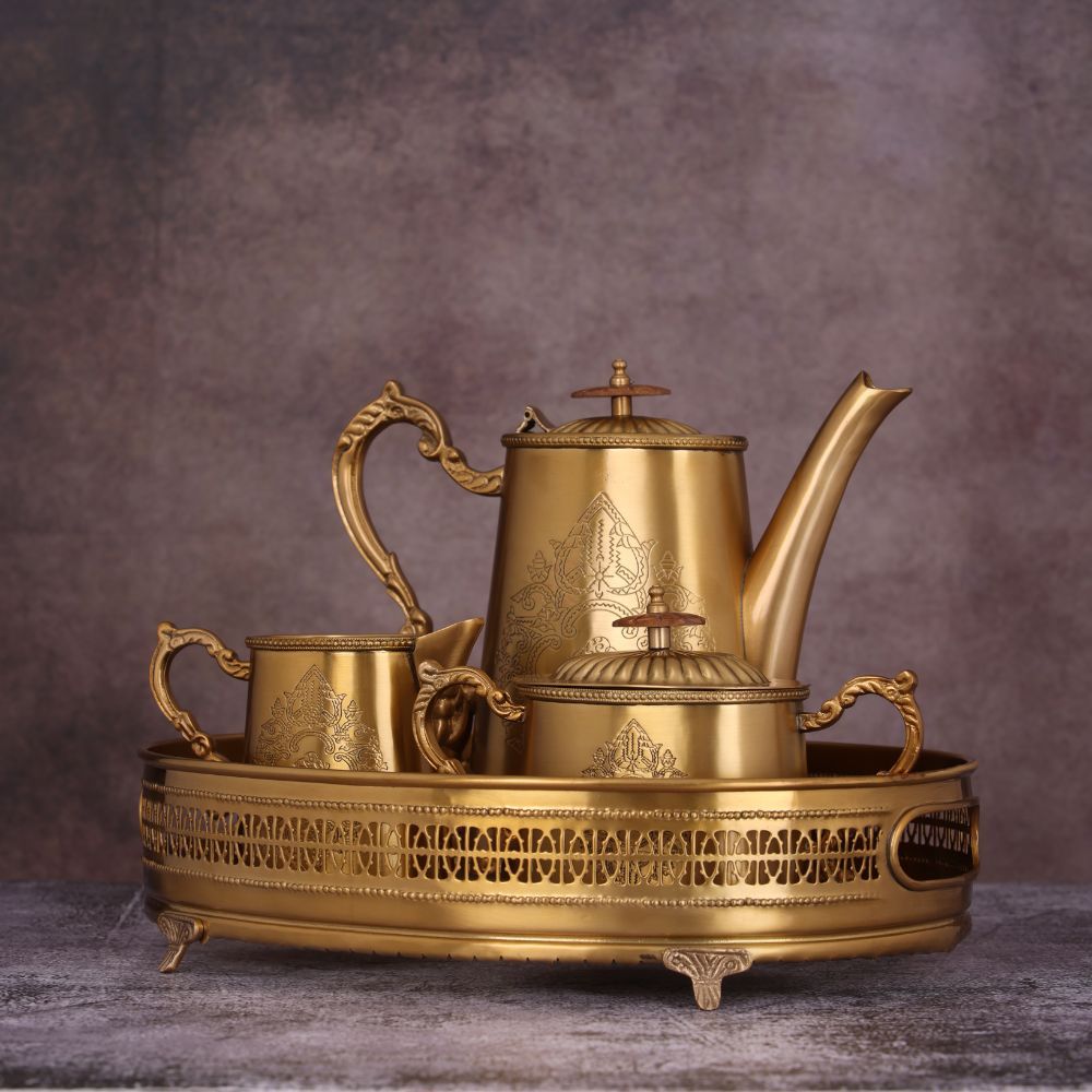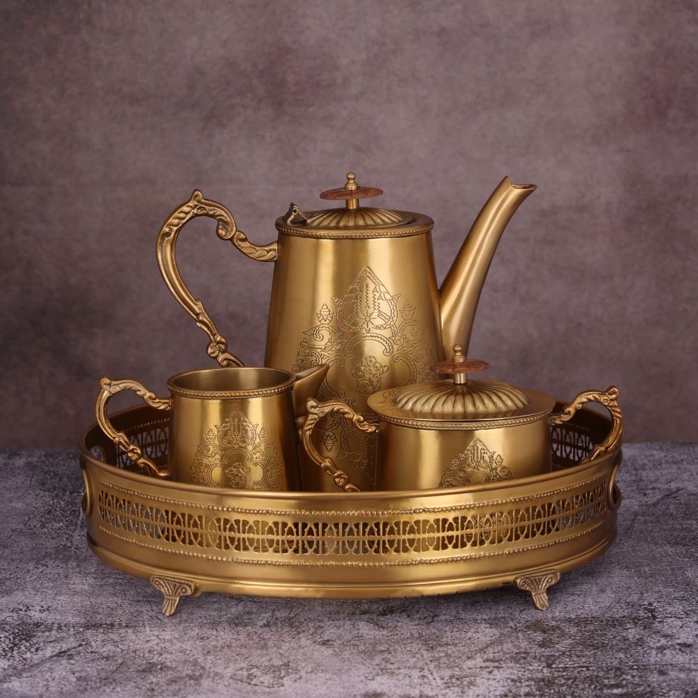 Featuring a stylish kettle, a functional milk dispenser, and a charming sugar pot, this set is made from high-quality brass for lasting durability