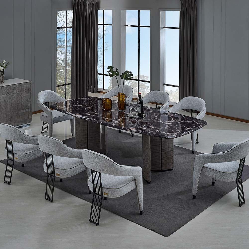 تم تصميم كل كرسي مع وضع الراحة والأناقة في الاعتبار. تتميز الكراسي بتنجيد من القماش الناعم الذي يضيف طبقة من النعومة والرقي للمجموعة.