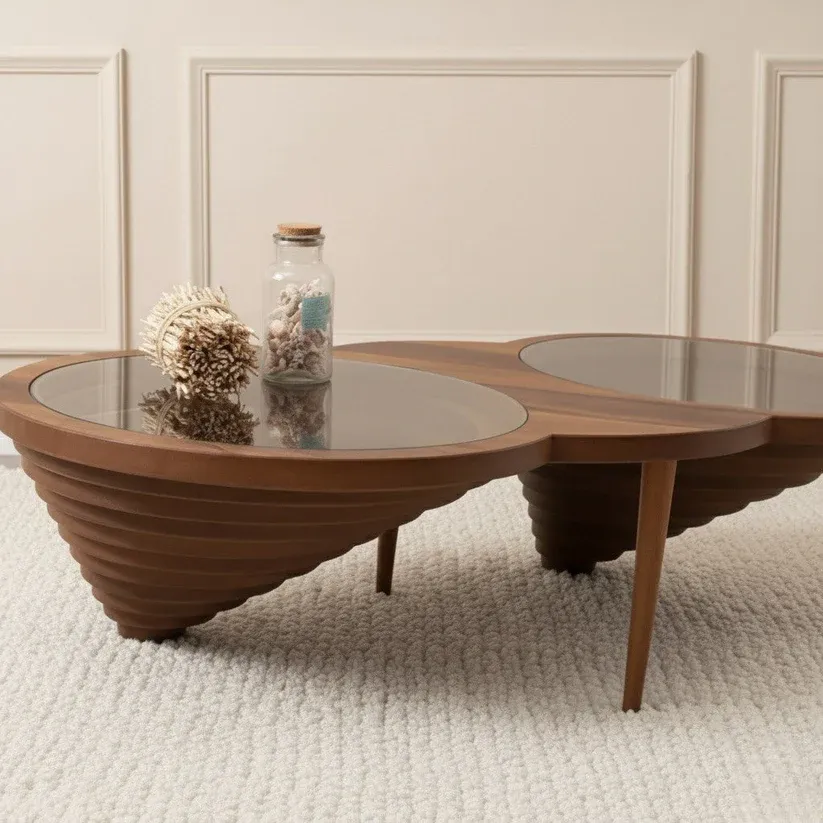 The Hamra Wooden Coffee Table seamlessly combines natural walnut wood with modern, sculptural design. Its swooping shape and 1960s-inspired aesthetics create a bold yet refined statement, making it a standout piece in any living space. The rich walnut veneer pairs beautifully with a clear tempered glass top, highlighting the table’s unique interlocking wooden base and curved geometric forms. Perfect as a centerpiece, it brings style and sophistication to contemporary or mid-century modern interiors.