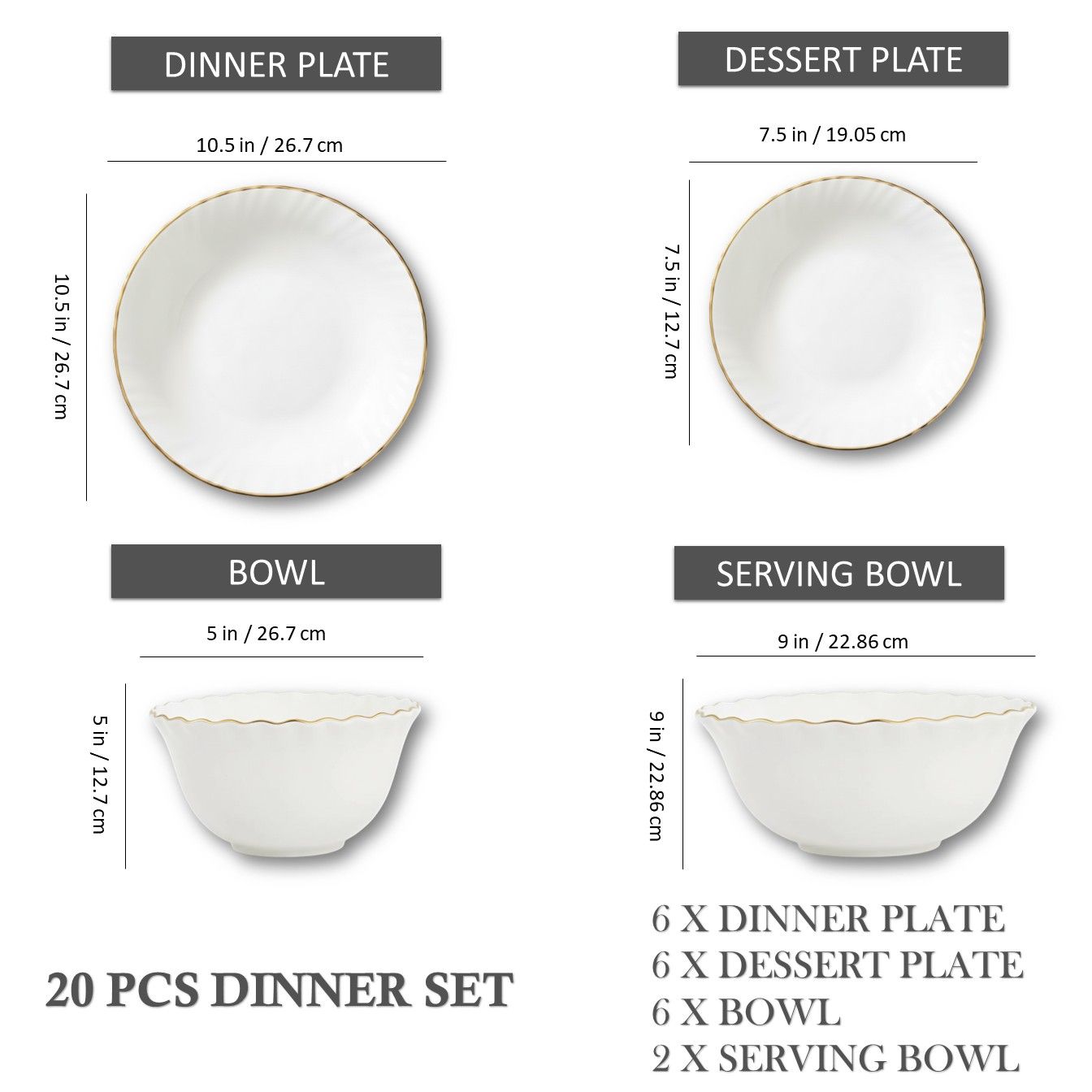Houzi 20 Pcs Dinnerware set Gold line Opal ware 6 x Dinner plate 6 x Dessert plate 6 x Bowl 2 x Serving Bowl Microwave Dishwasher safe