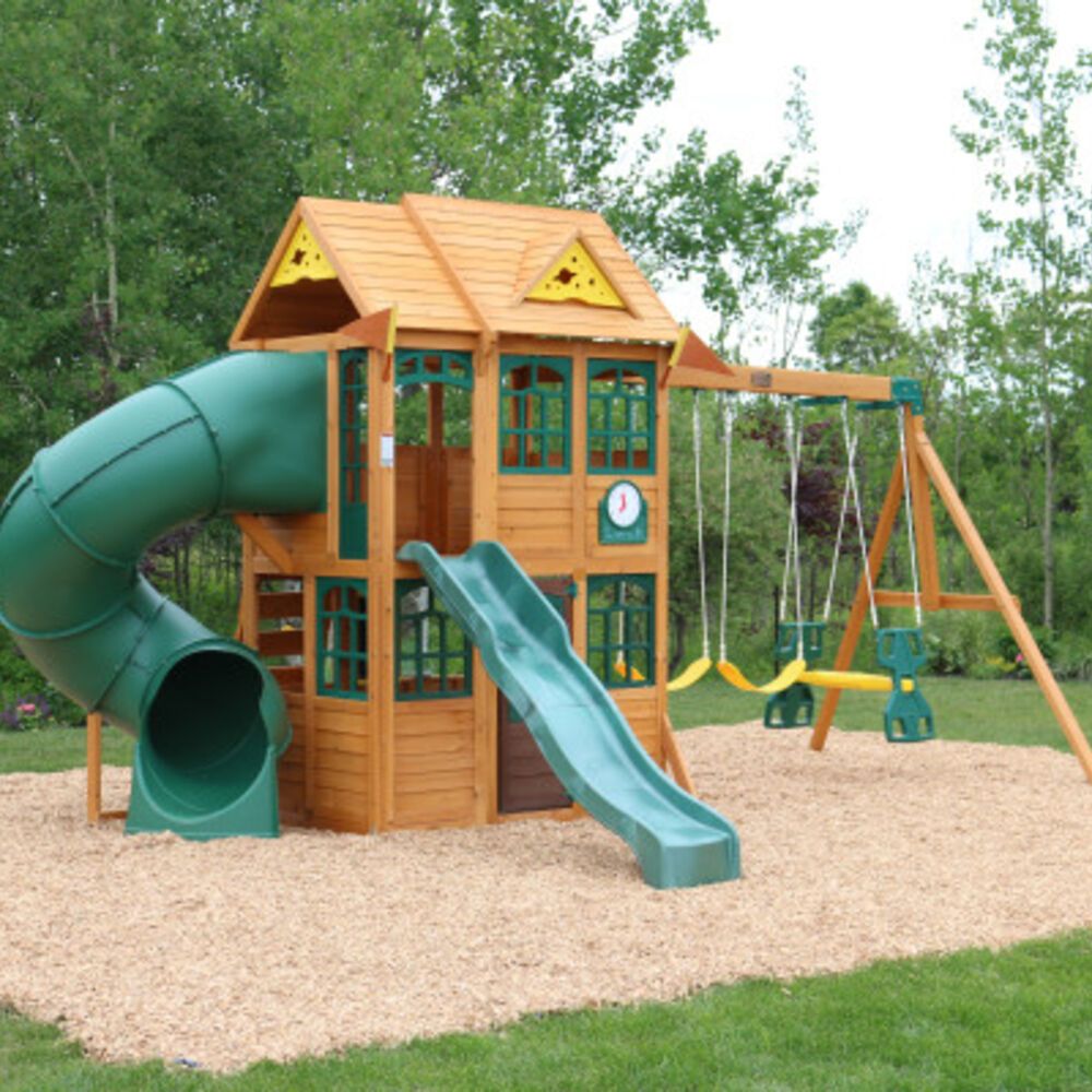 The sturdy Charleston Lodge Wooden Swing Set / Playset by KidKraft is built to take whatever 10 rambunctious kids can dish out. Each all-in-one activity center and playhouse features not one, but two durable slides: an extra-deep high-rail wave slide and an enclosed 12-foot Twist N’ Ride tube slide.