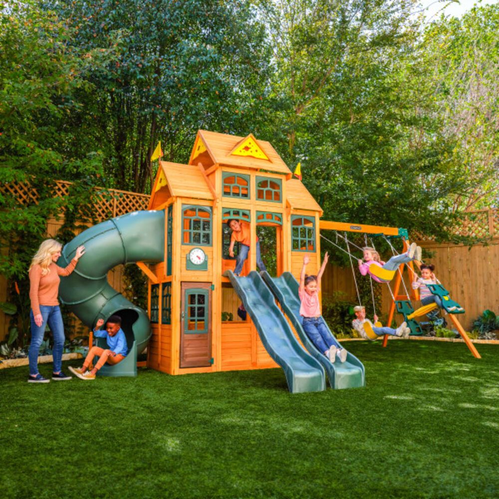 The full two-level structure is like having a playhouse and swing set in one, right in the comfort of your own yard.
