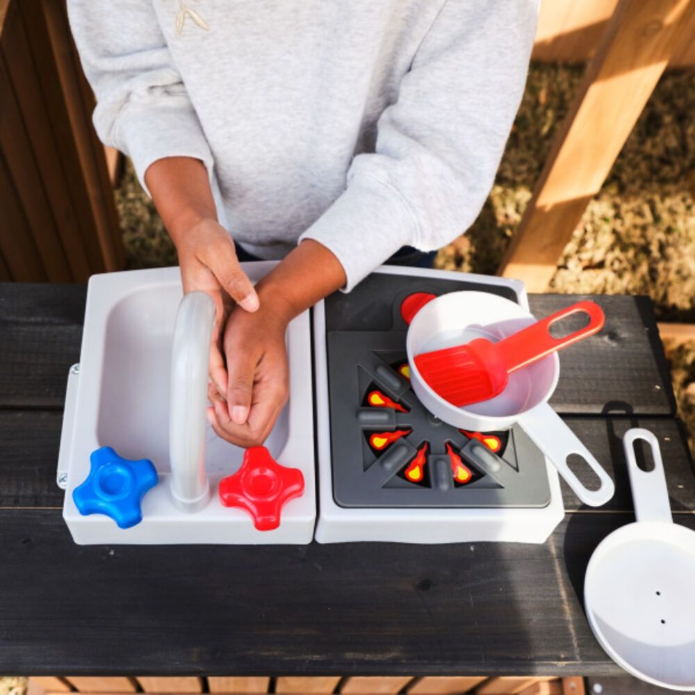 Kitchen with sink, burner and three utensils for kids to role play; ledge and bench to serve up guests.