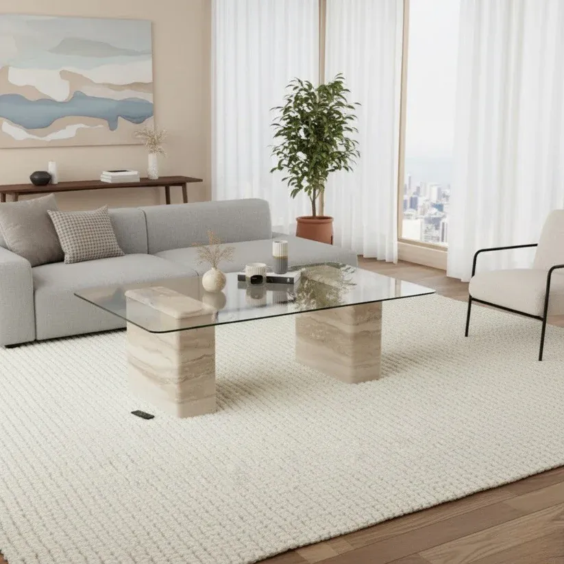 The Latte Coffee Table Travertine is a striking centerpiece that blends timeless Italian-inspired design with natural elegance. Crafted with a robust pillar base and topped with tempered glass, it offers both stability and sophistication. Its engineered travertine finish showcases layered ivory and beige tones, highlighting raw, authentic textures for a warm and inviting aesthetic. The rectangular silhouette provides ample surface space, making it practical for décor, books, or entertaining. Inspired by 1970s Italian modern furniture, the Latte Coffee Table seamlessly combines clean lines, durability, and contemporary charm, making it a versatile and enduring addition to any modern living space.