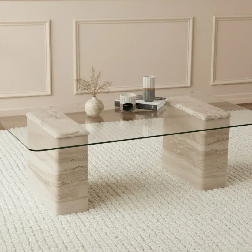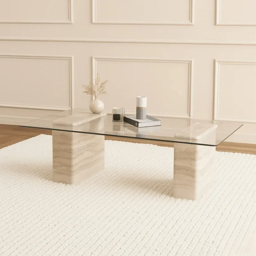 Latte Coffee Table Travertine Engineered travertine with tempered glass top L140xW75xH44