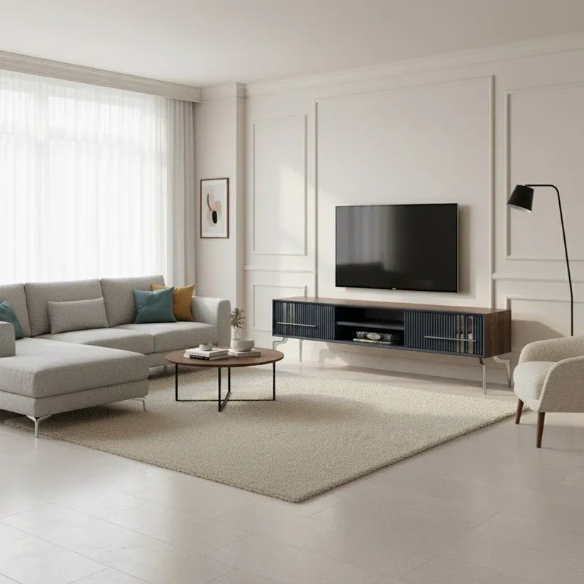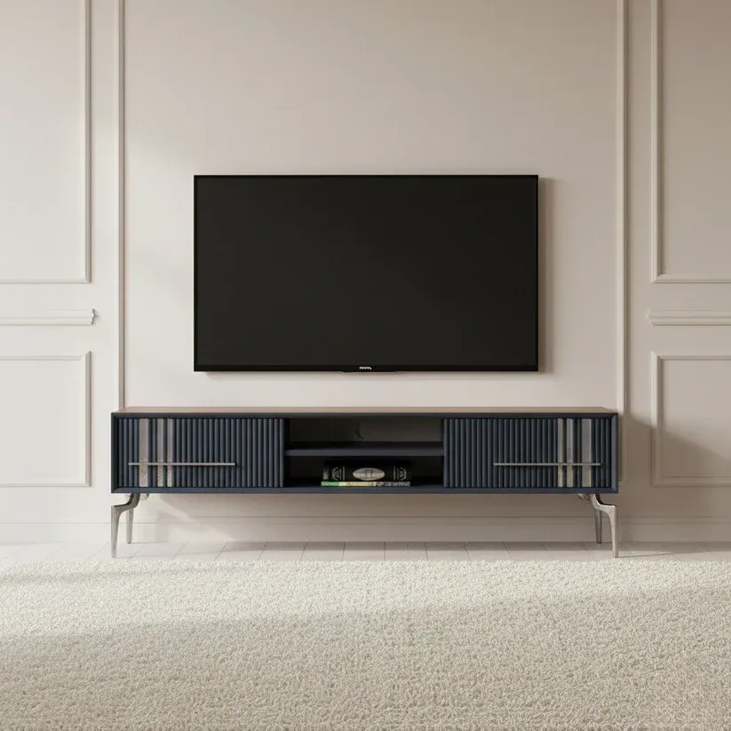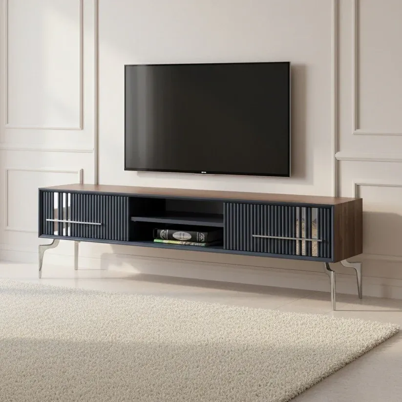 The central open shelves are ideal for media devices, complete with a cable outlet designed to handle multiple wires with ease. On either side, spacious ribbed grey drawers provide storage for DVDs, remotes, and accessories. The ribbed drawer fronts paired with polished silver chrome legs create a striking modern contrast, while the natural walnut veneer brings warmth and timeless elegance. This TV unit embodies the “less is more” design philosophy, blending minimalist style with premium details.