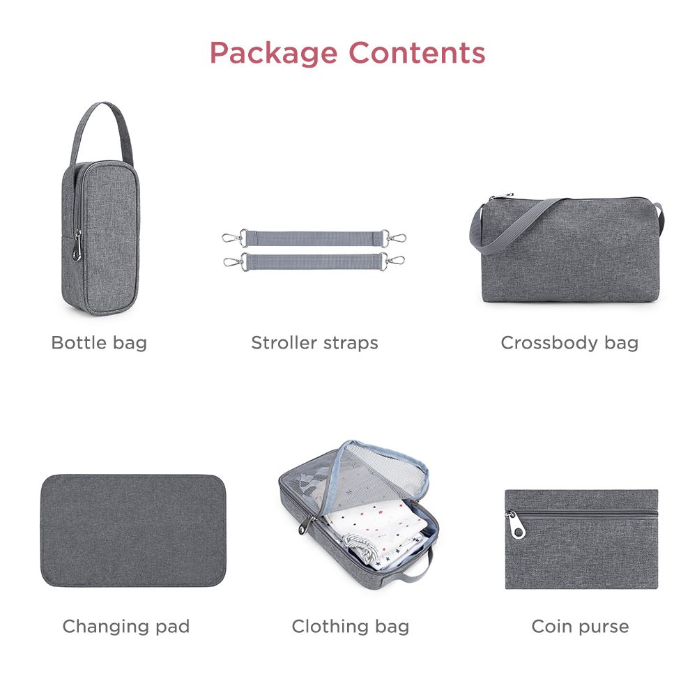 1- Diaper Bag, 1- Bottle Bag, 1- Crossbody Bag, 1- Clothing Bag, 1- Coin Purse, 1- Changing Mat, 1- Set Stroller Straps