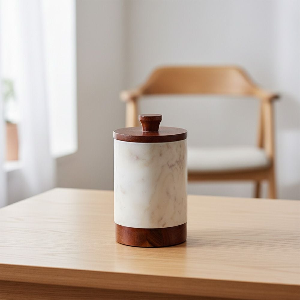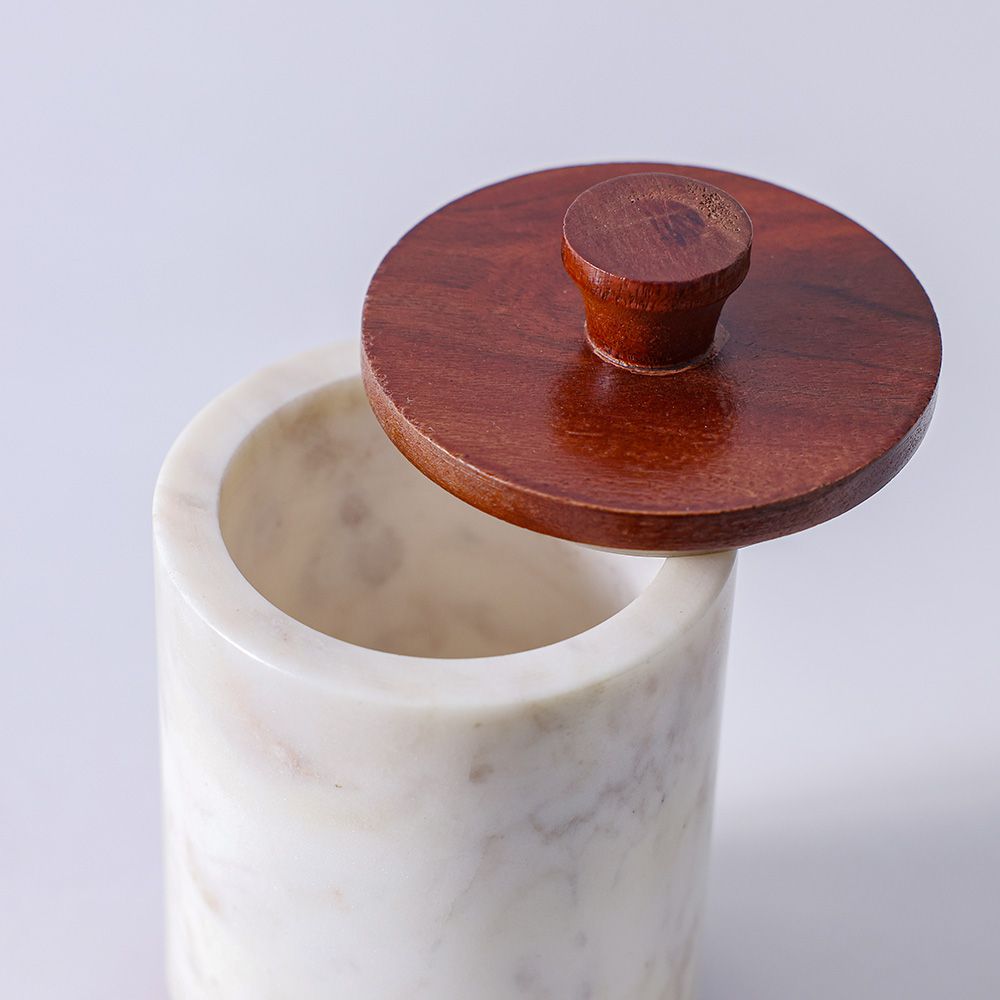 Stylish storage jars featuring a durable marble body and a natural wood lid.