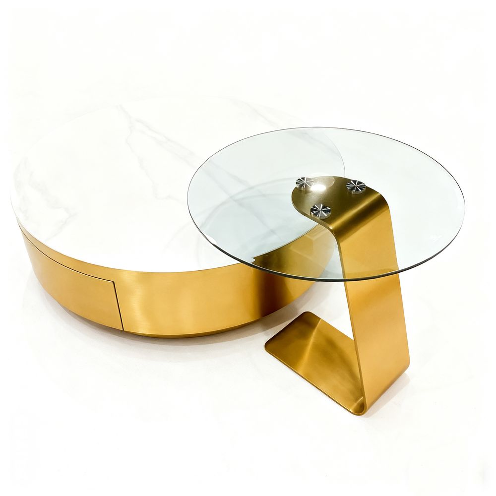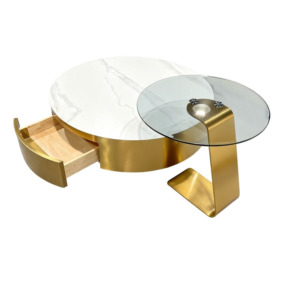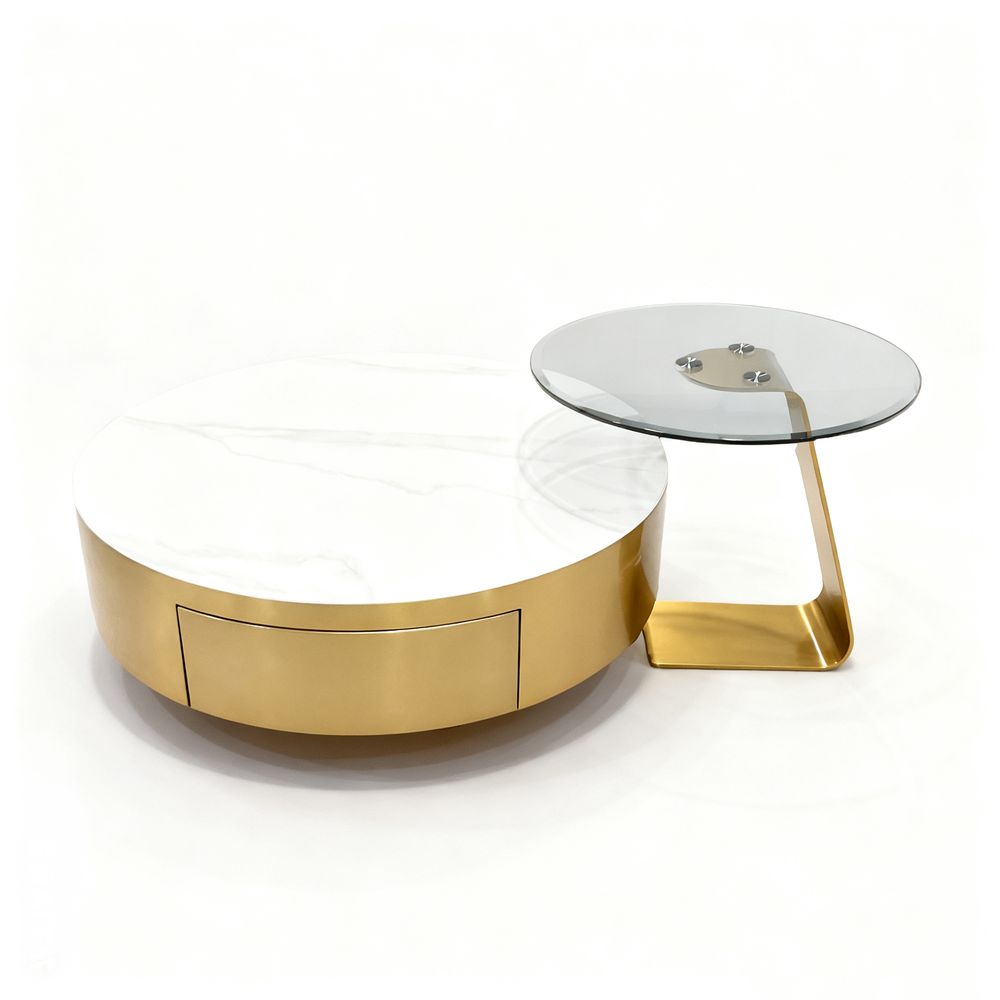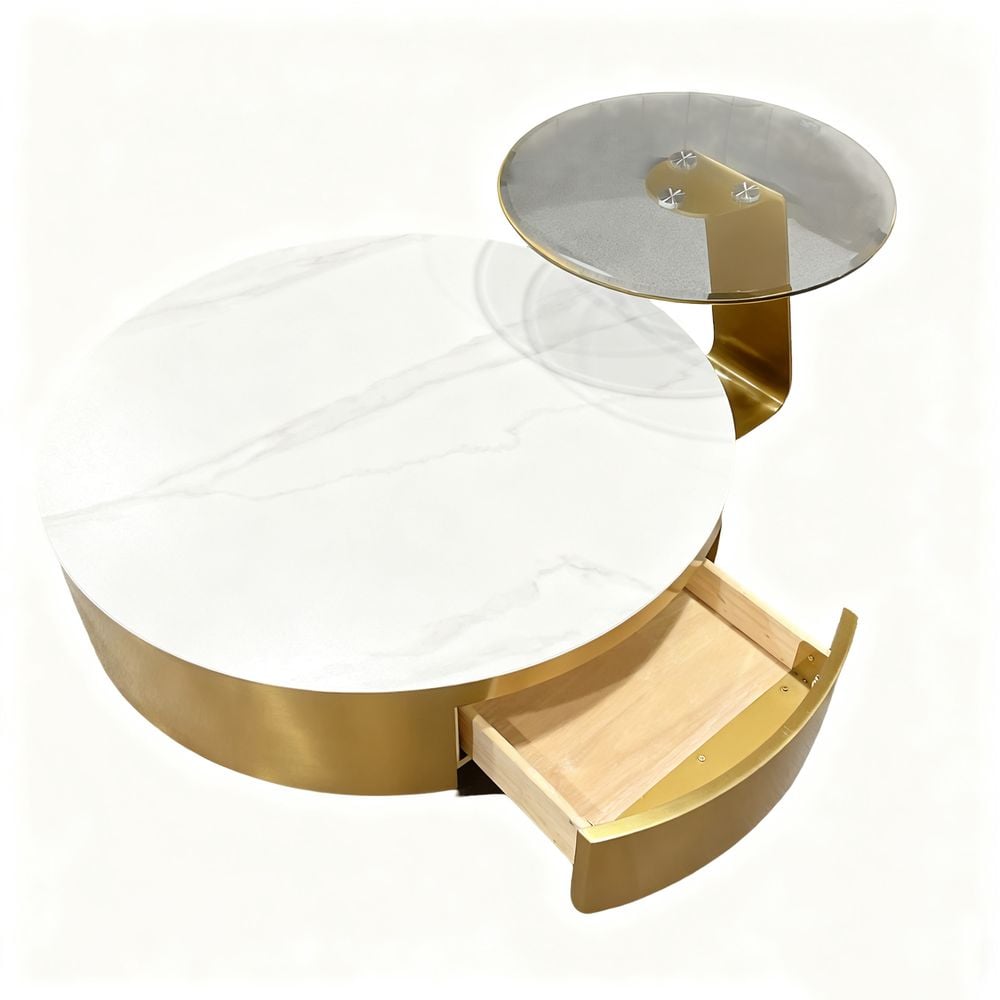 Maple Home Nesting Coffee Table Set,90cm&55cm Drawer White Marble Pattern&Tempered Glass Top,Gold Stainless Steel Frame Living Room Furniture