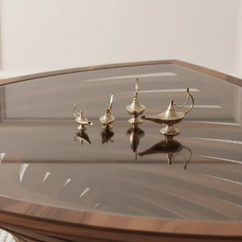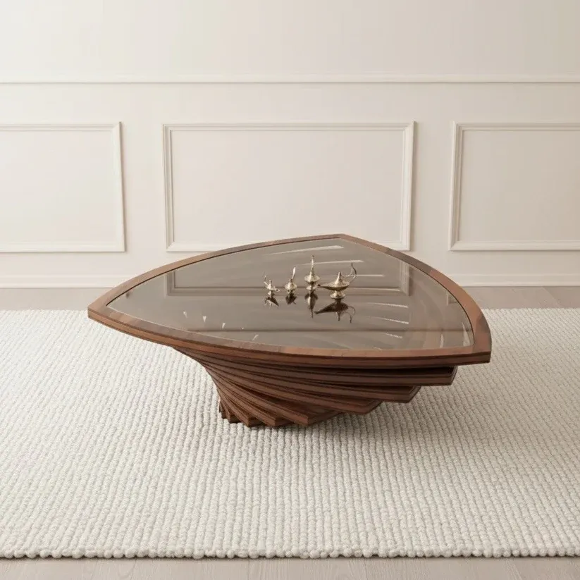 Inspired by mid-century modern design, the Midas table showcases a striking triangular shape paired with a stained walnut veneer finish. The thick tempered glass top enhances its sleek look while letting the beauty of your interior shine through. Built with high-quality European-standard engineered wood, walnut veneer, and durable glass, this table offers both longevity and style—ideal for modern homes that value elegance and function.